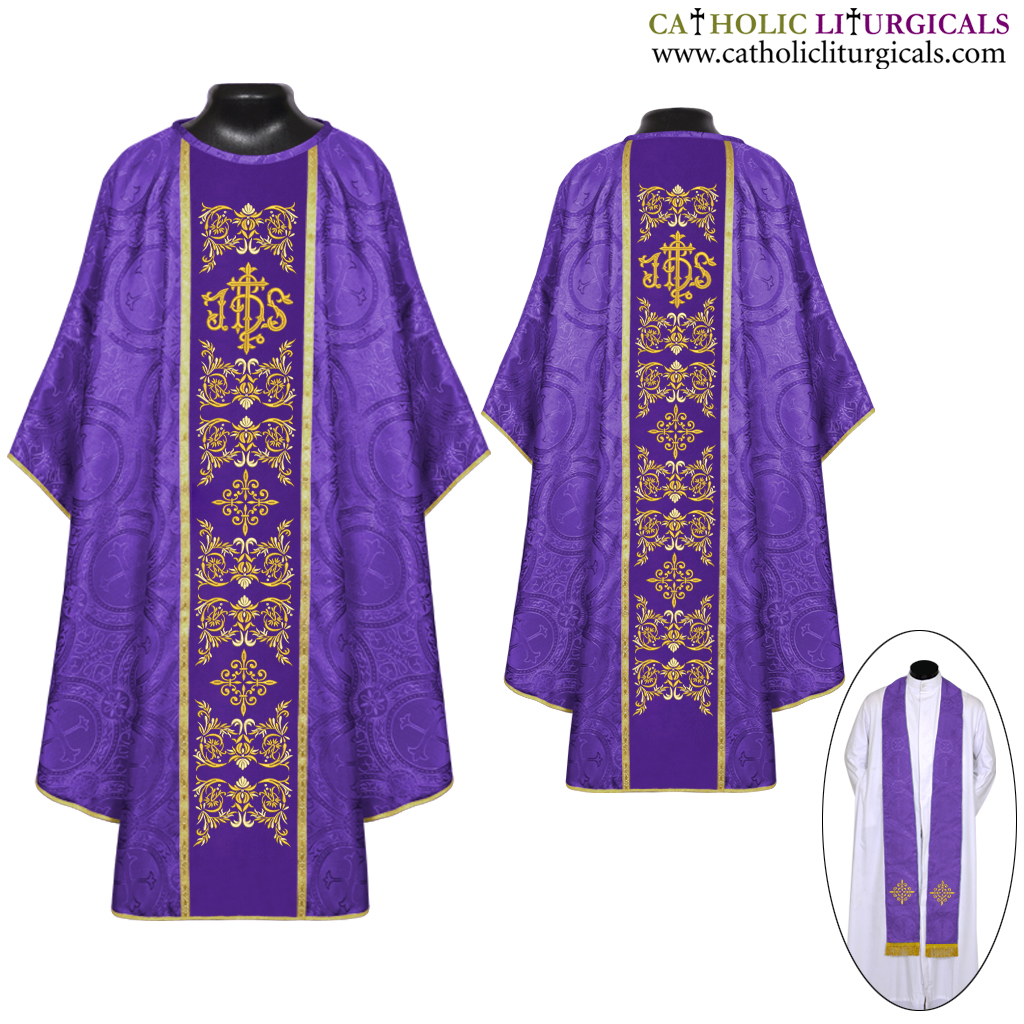 The vestment is made of Damask Fabric with cross designs. The orphreys are made of silk fabric and are intricately hand-embroidered with IHS motif and floral designs. The Vestment comes with a matching stole. The Stole measures 48 inches with a cross at the bottom, a small golden cross on the back of the neck and fringes at the ends.