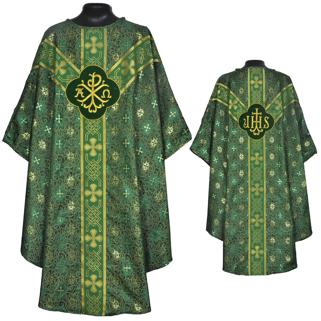 The vestment is made of Metallic Brocade Fabric with Cross Designs. The St. Andrews orphreys (also called - M orphreys) are made of high quality polyester braids and are embroidered with Chi-Rho motif on the front & IHS on the back.
