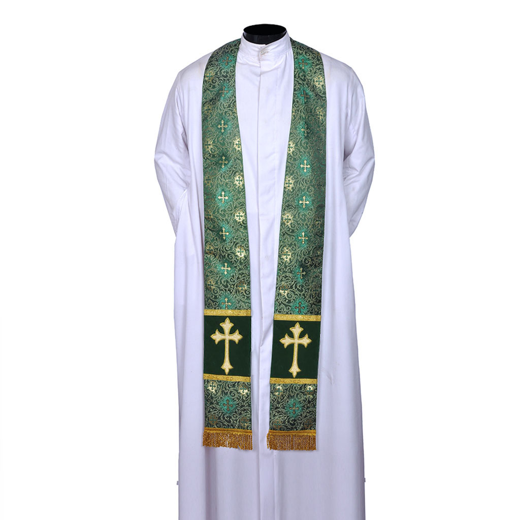 The vestment is accompanied by a matching stole, a vital accessory in spiritual rituals. The stole measures 48 inches, featuring a cross at the bottom and a delicate golden cross on the back of the neck. Fringes at the ends add a touch of elegance.