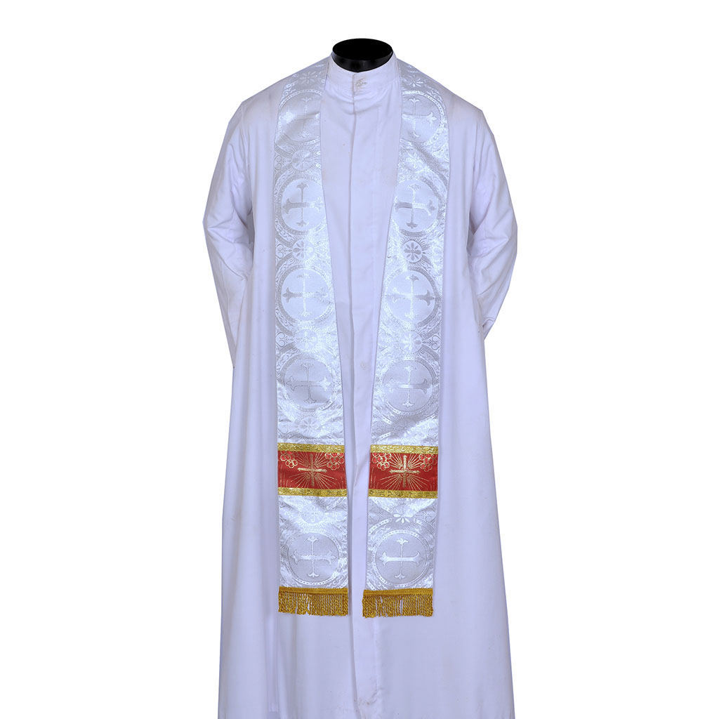The vestment is accompanied by a matching stole, a vital accessory in spiritual rituals. The stole measures 48 inches, featuring a cross at the bottom and a delicate golden cross on the back of the neck. Fringes at the ends add a touch of elegance.