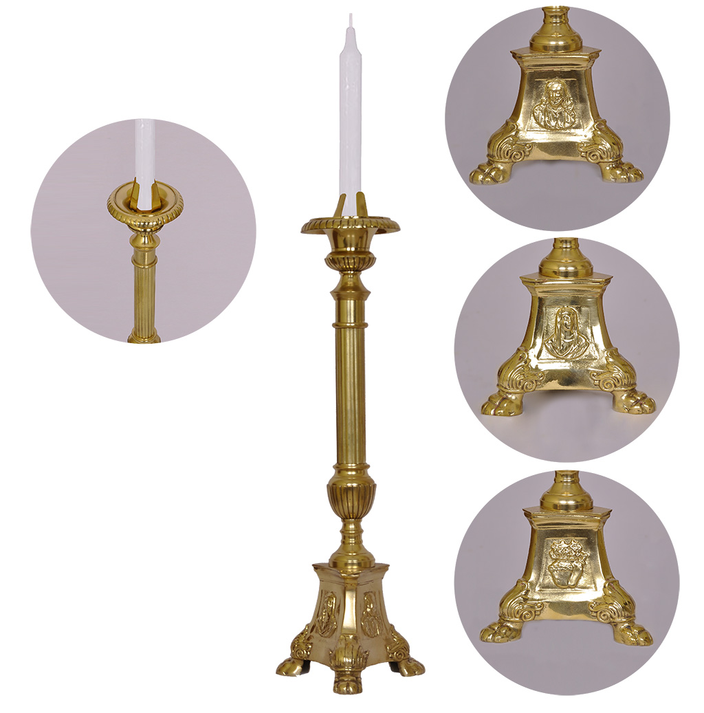 This is a replica of an antique candle stand that we got from a old Portuguese church. The candle stand has the face of Jesus on one side of the base, Image of virgin Mary on the second face and the Sacred Hearts on the 3rd side. The base support on 3 sides seems to be like lions leg. The antique candle stand had a mark of year 1895. We have tried to keep all the aspects exactly the same during metal casting. These Candle stands are handmade with metal Brass and are sprayed with lacquer to retain the brass aspect. The Candle Sticks stand 19.5 inches (50 cm) tall with a triangular base of 6 inches (15 cm). The candle stick come with a 2inch high candle holder and 1.5inch diameter candle can be used. They do not have any nail at the bottom and oil candles can also be used.