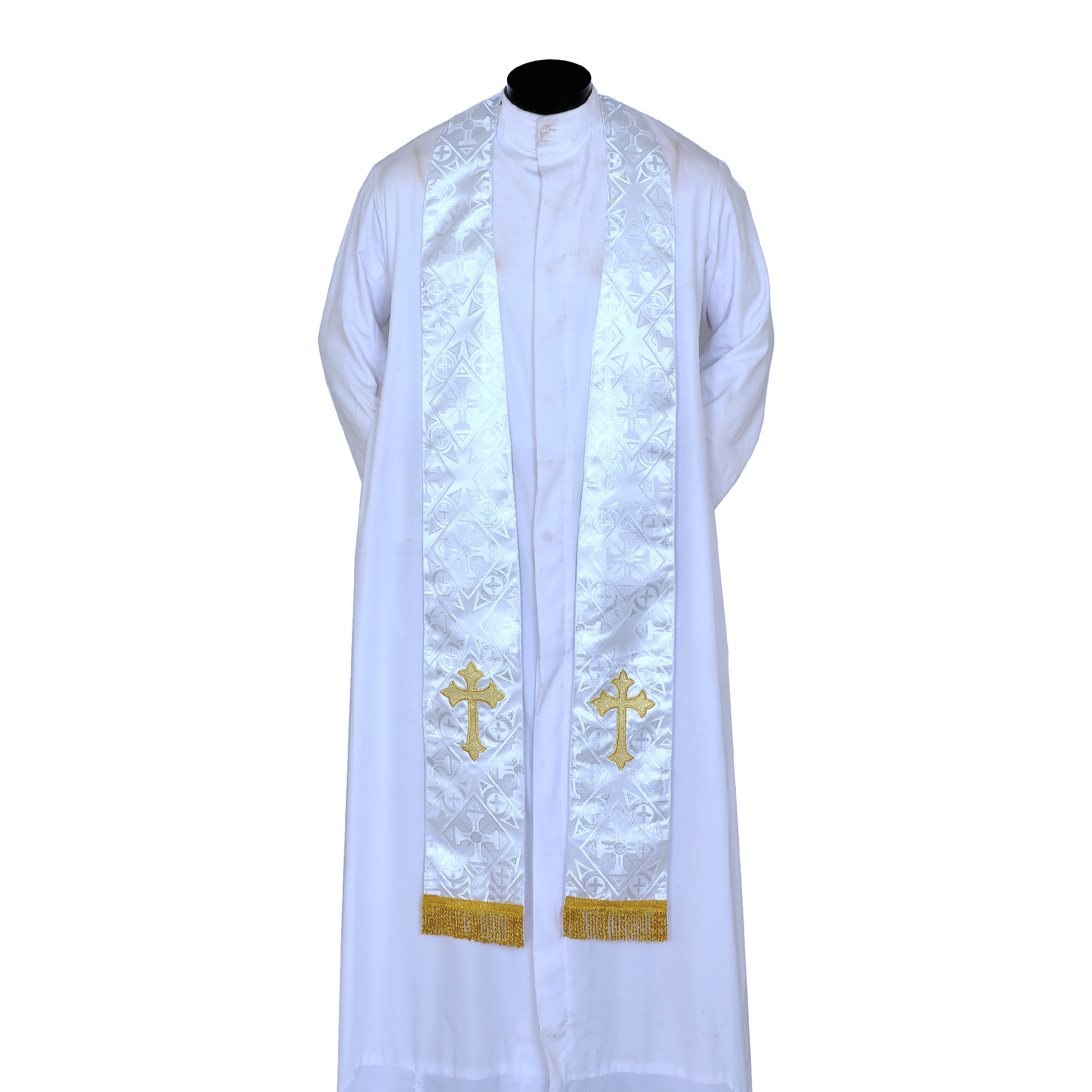 The vestment is accompanied by a matching stole, a vital accessory in spiritual rituals. The stole measures 48 inches, featuring a cross at the bottom and a delicate golden cross on the back of the neck. Fringes at the ends add a touch of elegance.