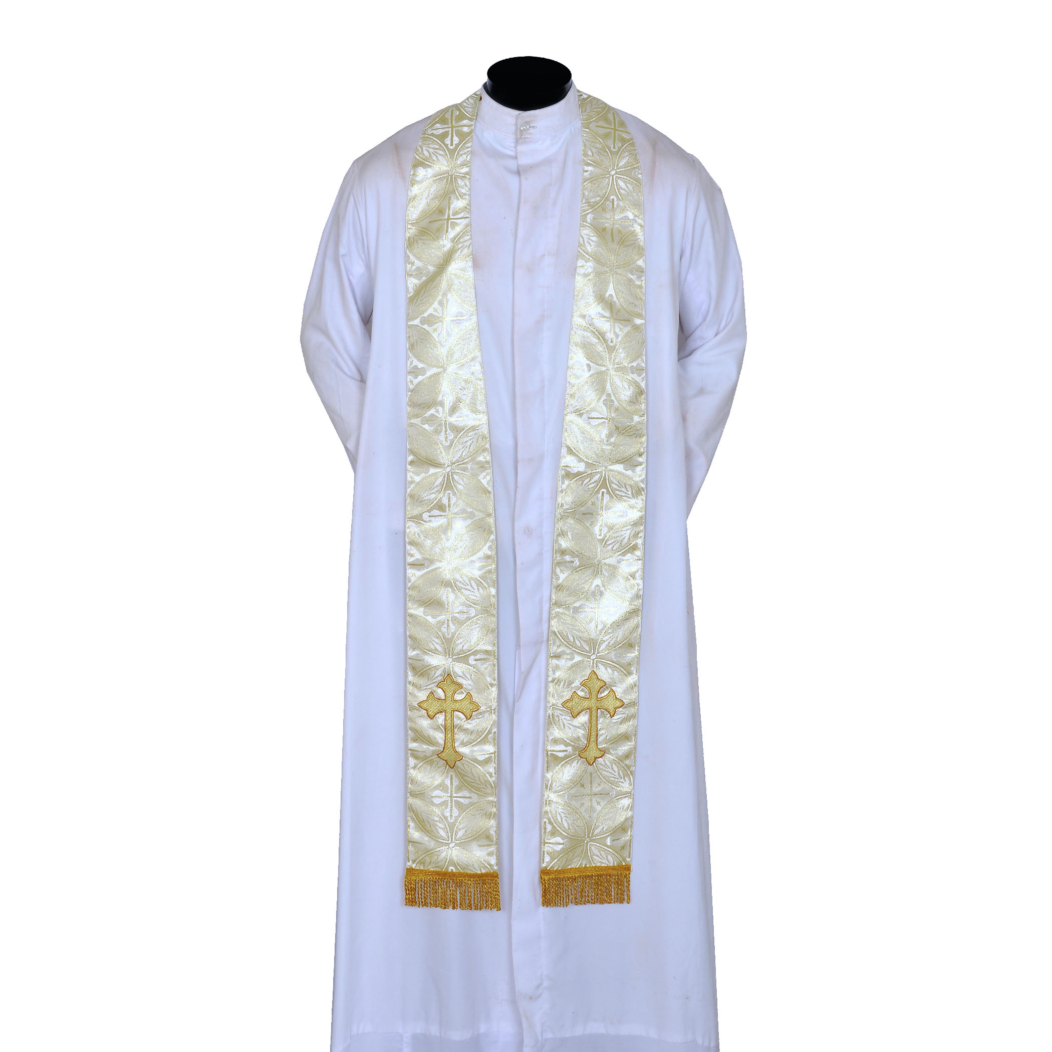 The vestment is accompanied by a matching stole, a vital accessory in spiritual rituals. The stole measures 48 inches, featuring a cross at the bottom and a delicate golden cross on the back of the neck. Fringes at the ends add a touch of elegance.