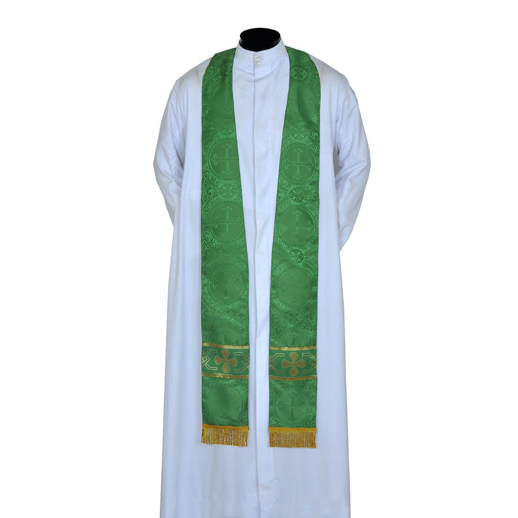 The vestment is accompanied by a matching stole, a vital accessory in spiritual rituals. The stole measures 48 inches, featuring a cross at the bottom and a delicate golden cross on the back of the neck. Fringes at the ends add a touch of elegance.