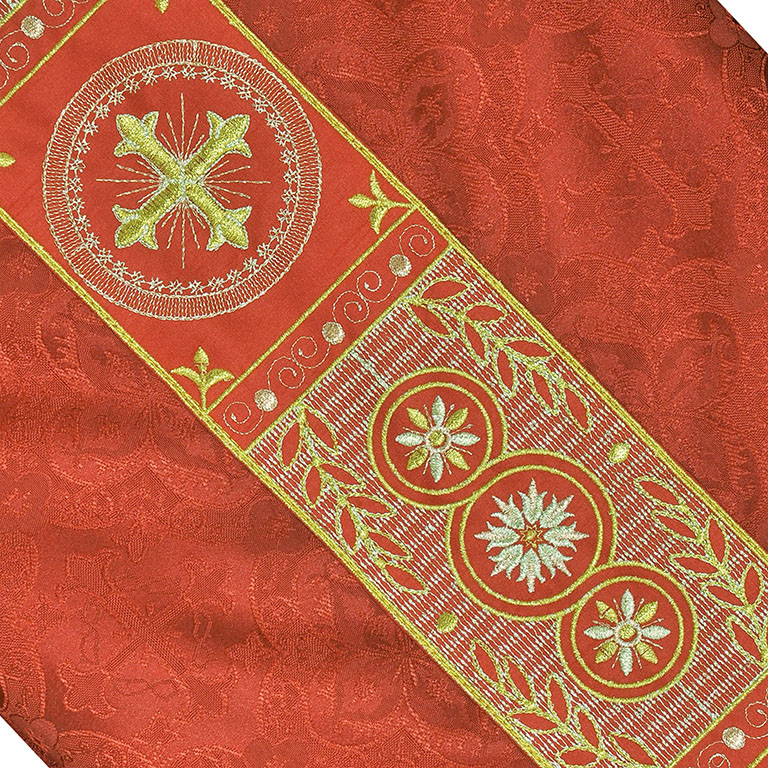 This Chasuble is normally used as co-celebrant chasuble with a straight orphrey. The chasuble is made with Cross Designed Church Damask/Brocade fabric (polyester) and the orphreys are made in silk fabric with embroidery designs in metallic gold yarn.
