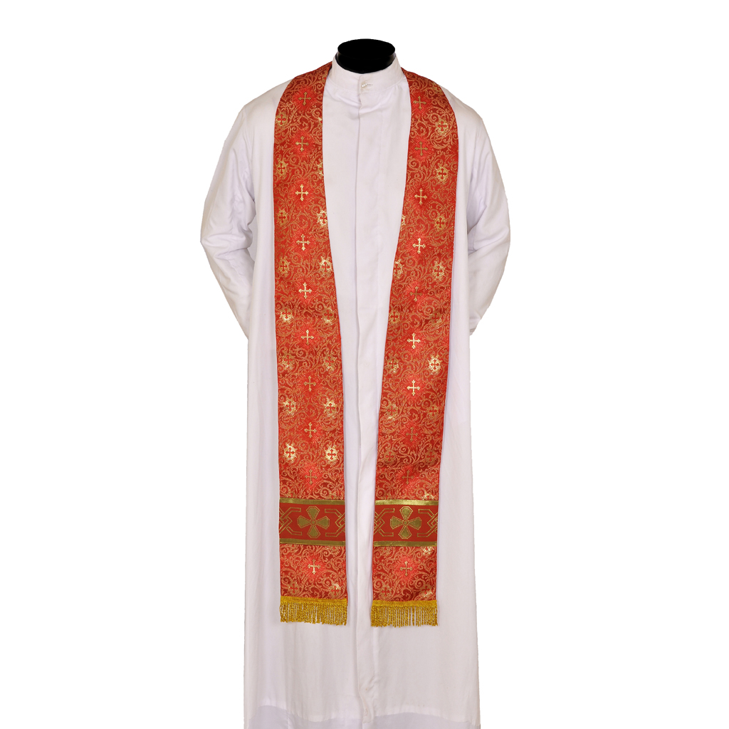 The vestment is accompanied by a matching stole, a vital accessory in spiritual rituals. The stole measures 48 inches, featuring a cross at the bottom and a delicate golden cross on the back of the neck. Fringes at the ends add a touch of elegance.