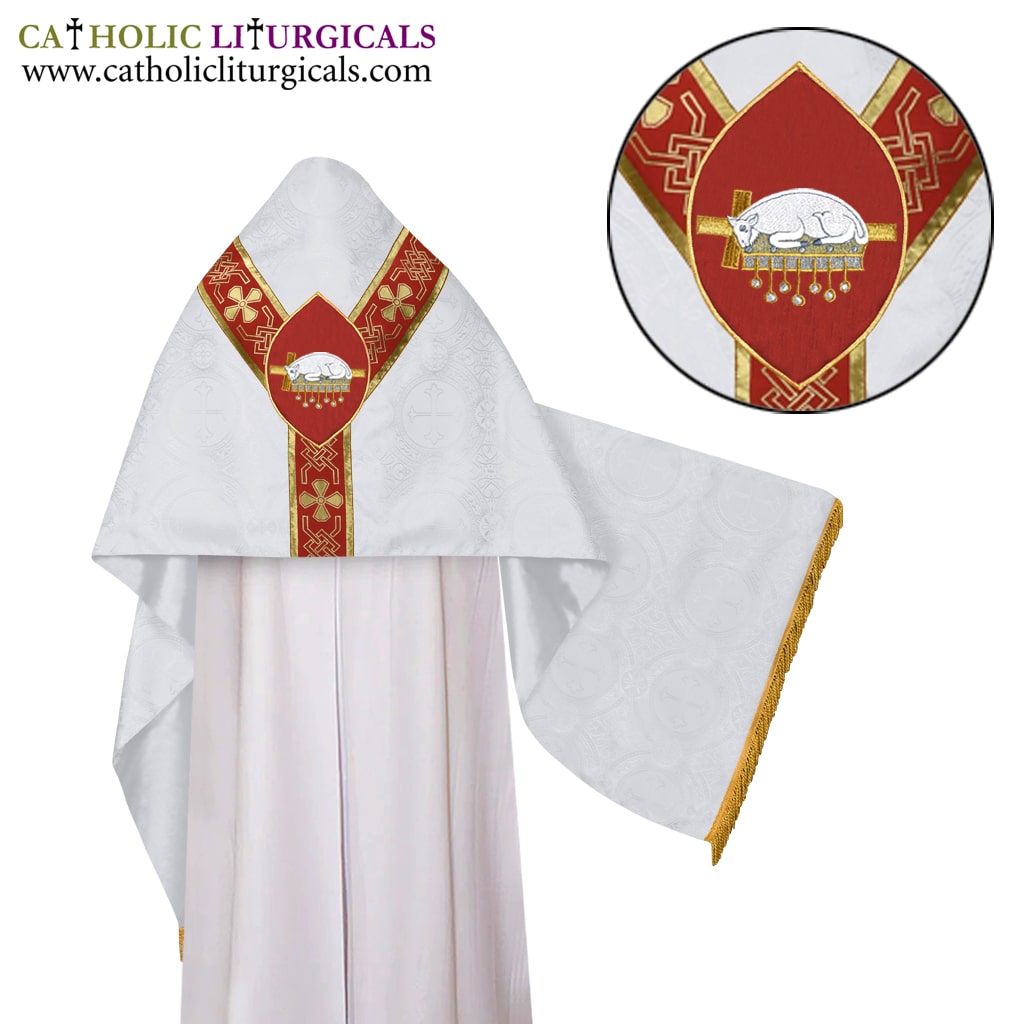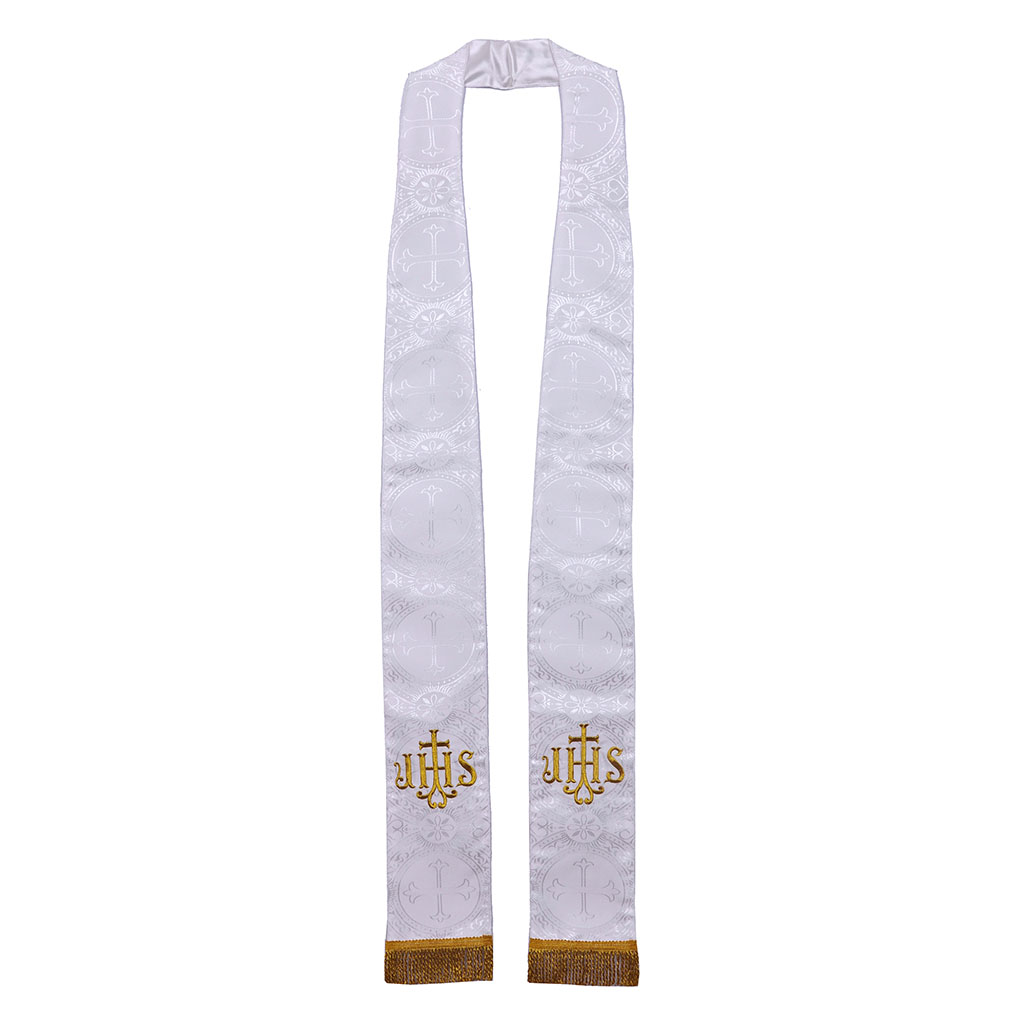 The Dalmatic vestment is accompanied by a matching deacon stole. The stole measures 44 inches, featuring a cross at the bottom and a delicate golden cross in the middle. Fringes at the ends add a touch of elegance.
