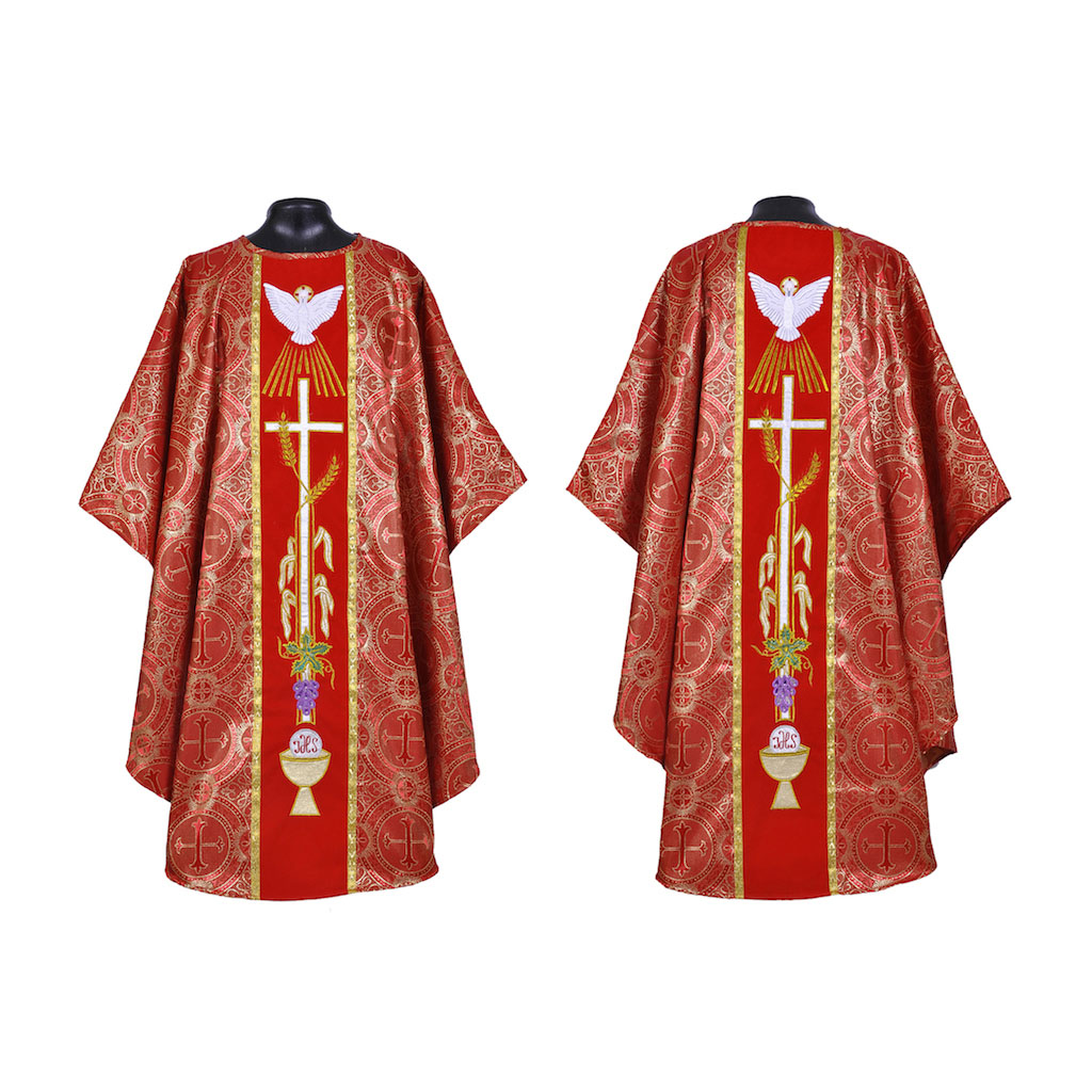 The vestment is made of Brocade Fabric with Cross Designs. The orphreys are made of high quality velour fabric and are beautifully embroidered with Metallic Gold yarn.