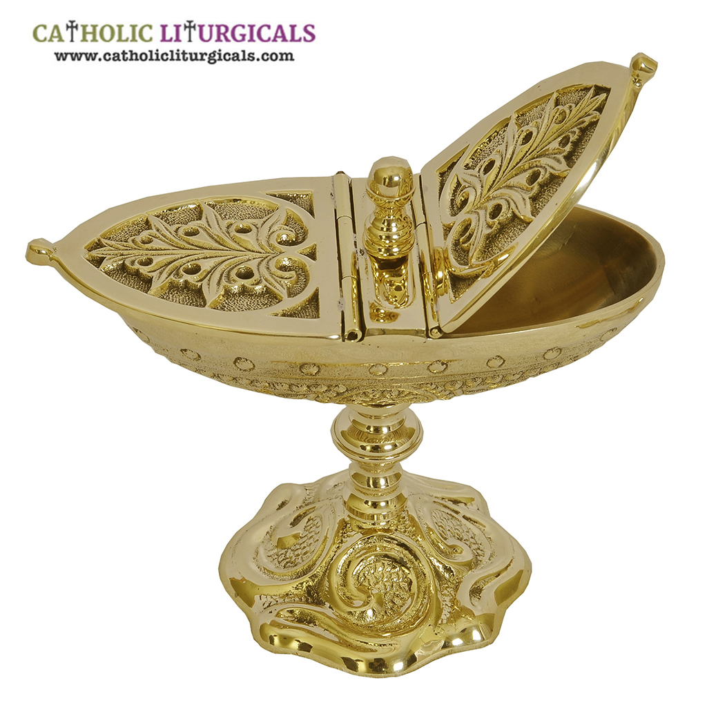 A Incense Boat is a liturgical vessel, oblong in shape, in which incense is kept and transferred to a censer/ thurible by means of a spoon.