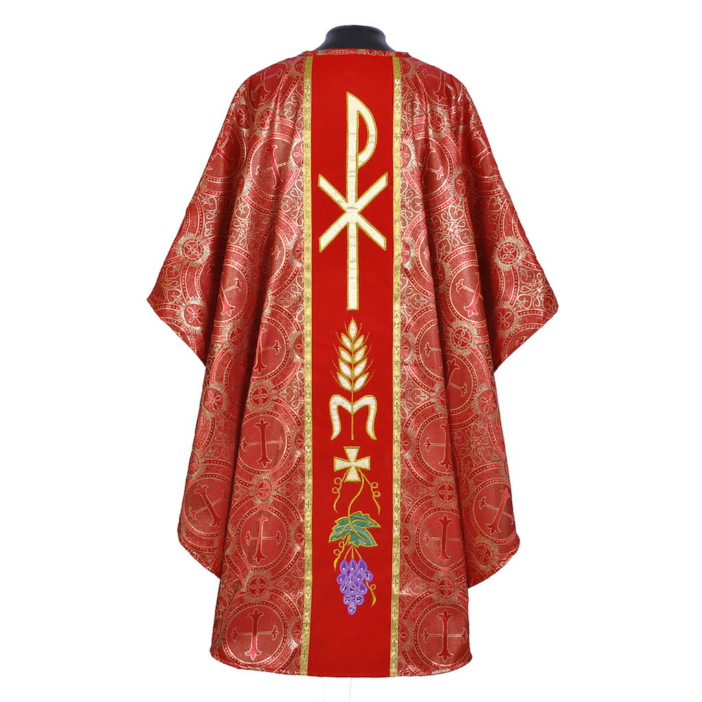 The vestment is made of Brocade Fabric with Cross Designs. The orphreys are made of high quality velour fabric and are beautifully embroidered with Metallic Gold yarn.