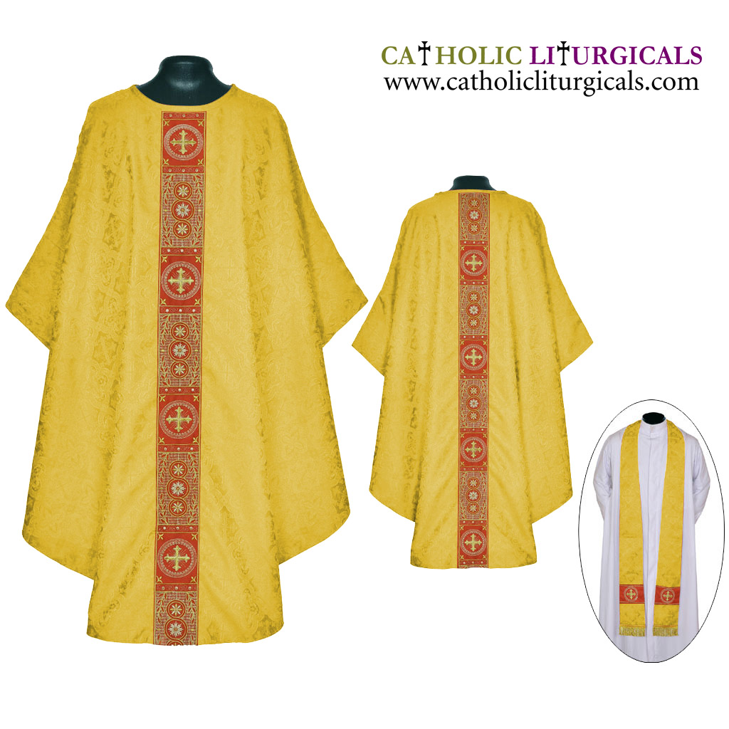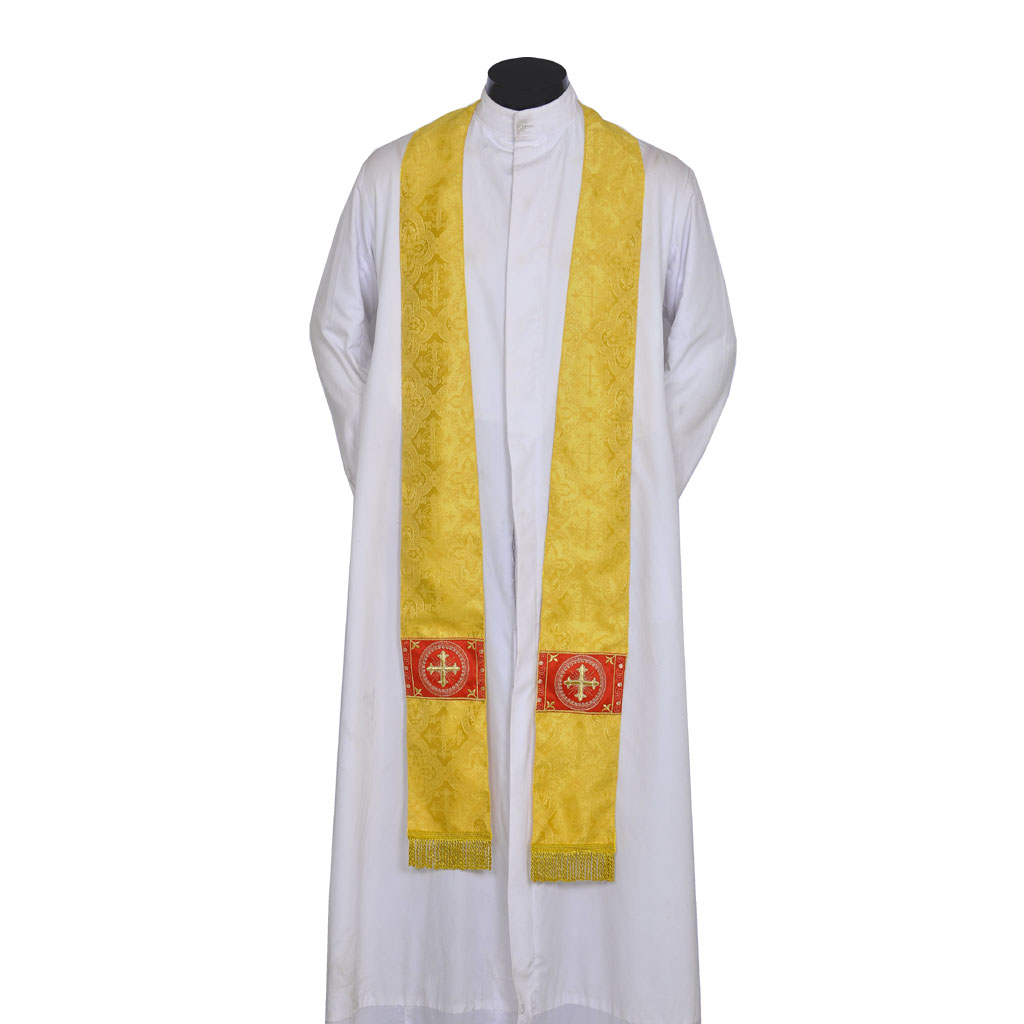 This set consists of a Cope and Stole. The material of the garments is made of Church Brocade fabric with Cross designs and the Orphreys are fully embroidered with cross designs. The cope comes with a Matching Stole.