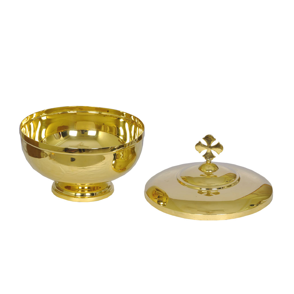 This Ciborium is made of Brass Sheet metal and is 24 carat Gold plated. The Ciborium stands 8 inch (20 cm) tall. The base of the chalice is not left hollow and is covered with a base plate. The Ciborium comes with a tight fitting lid. This Ciborium can hold approximately 700-750 hosts (of 1 inch size)