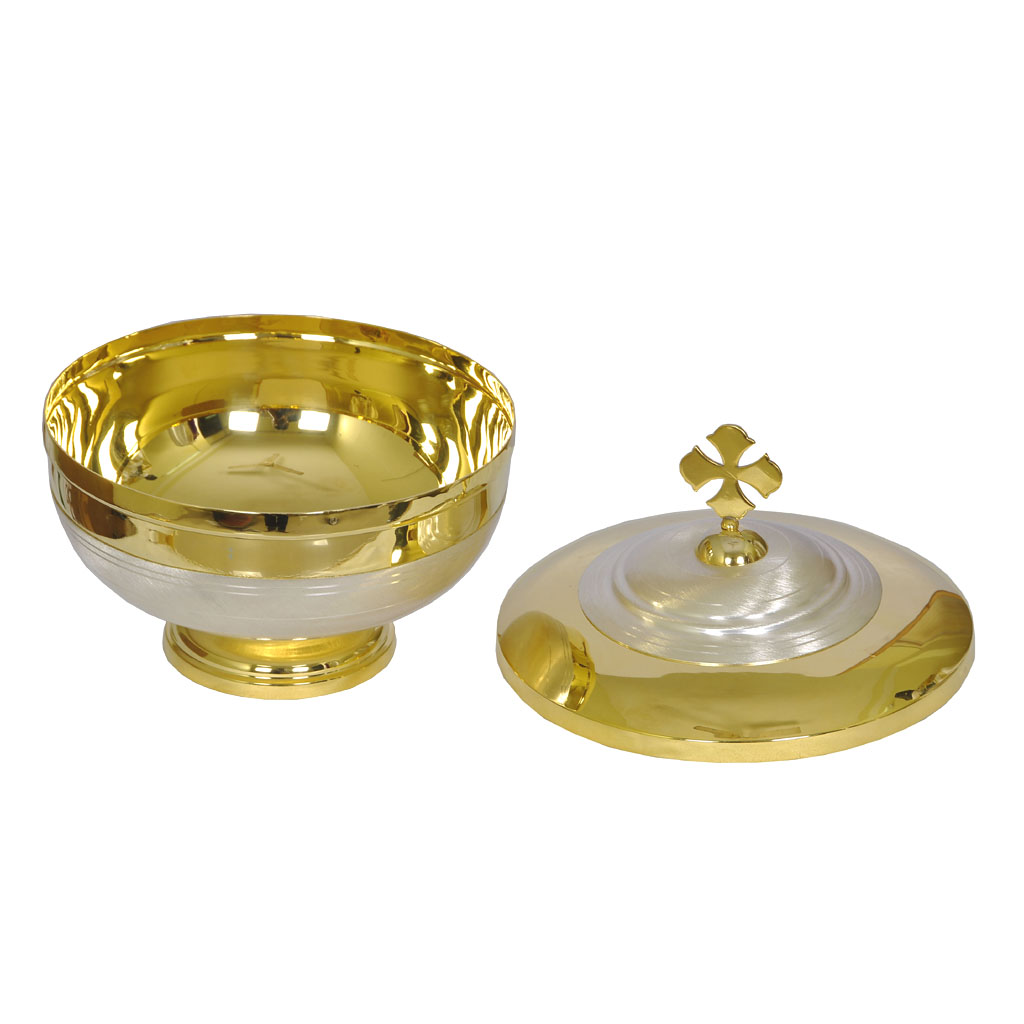 This Ciborium is made of Brass Sheet metal and is 24 carat Gold plated. The Ciborium comes with an extra layer which is Sterling Silver Plated. The Ciborium stands 8 inch (20 cm) tall. The base of the chalice is not left hollow and is covered with a base plate. The Ciborium comes with a tight fitting lid. This Ciborium can hold approximately 700-750 hosts (of 1 inch size)