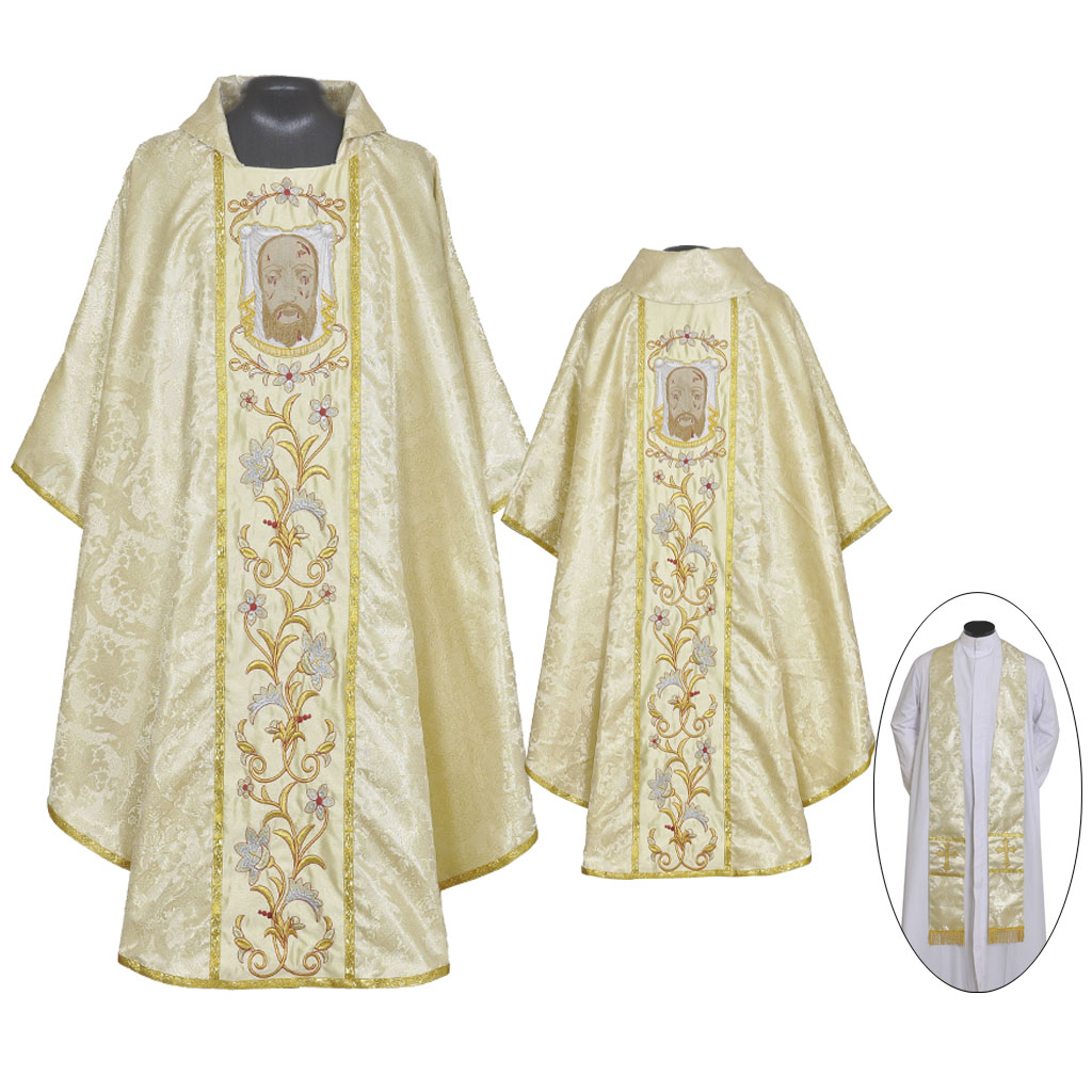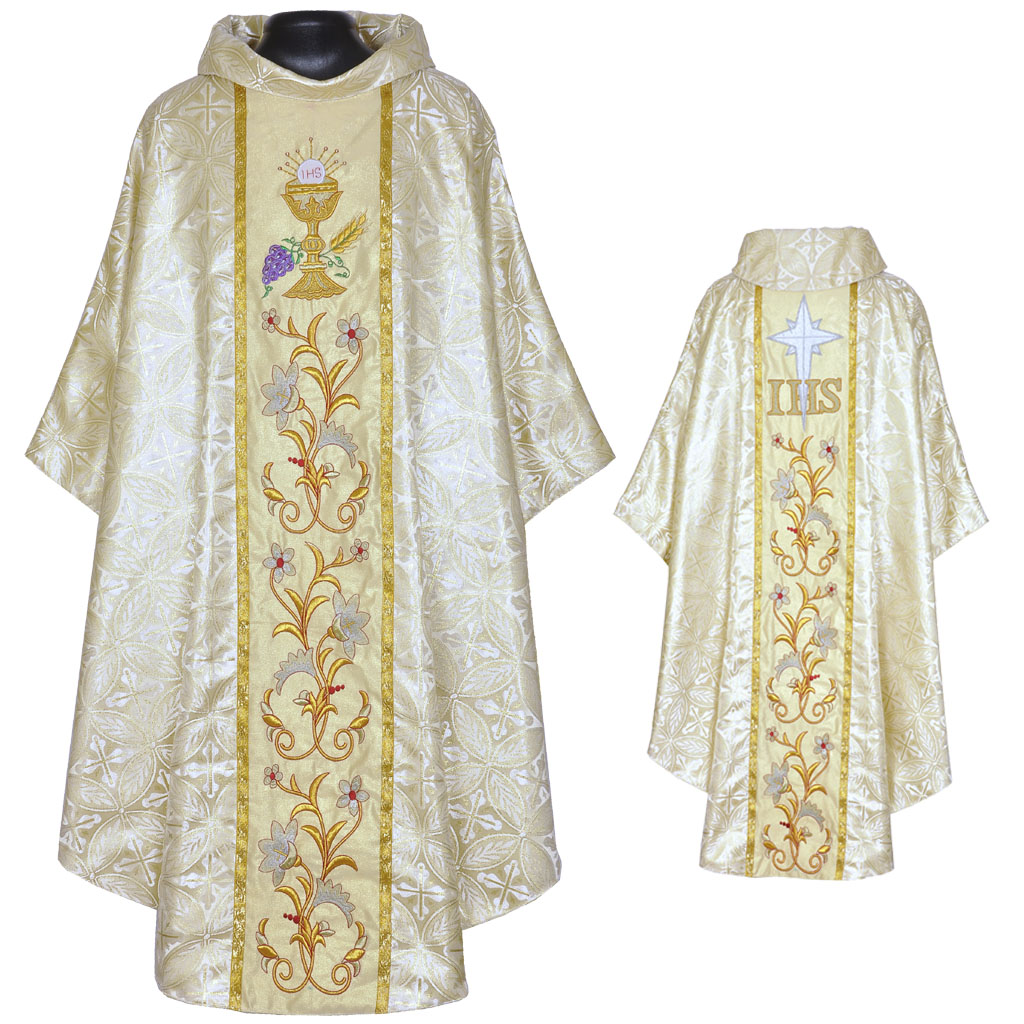 This set consists of a Cope and Stole. The material of the garments is made of Church Brocade/ Damask fabric with Cross designs. The Orphreys are made of metallic Gold embroidery with Floral designs. The Hood of the cope is hand embroidered with metallic gold yarns. The cope comes with a matching Stole.