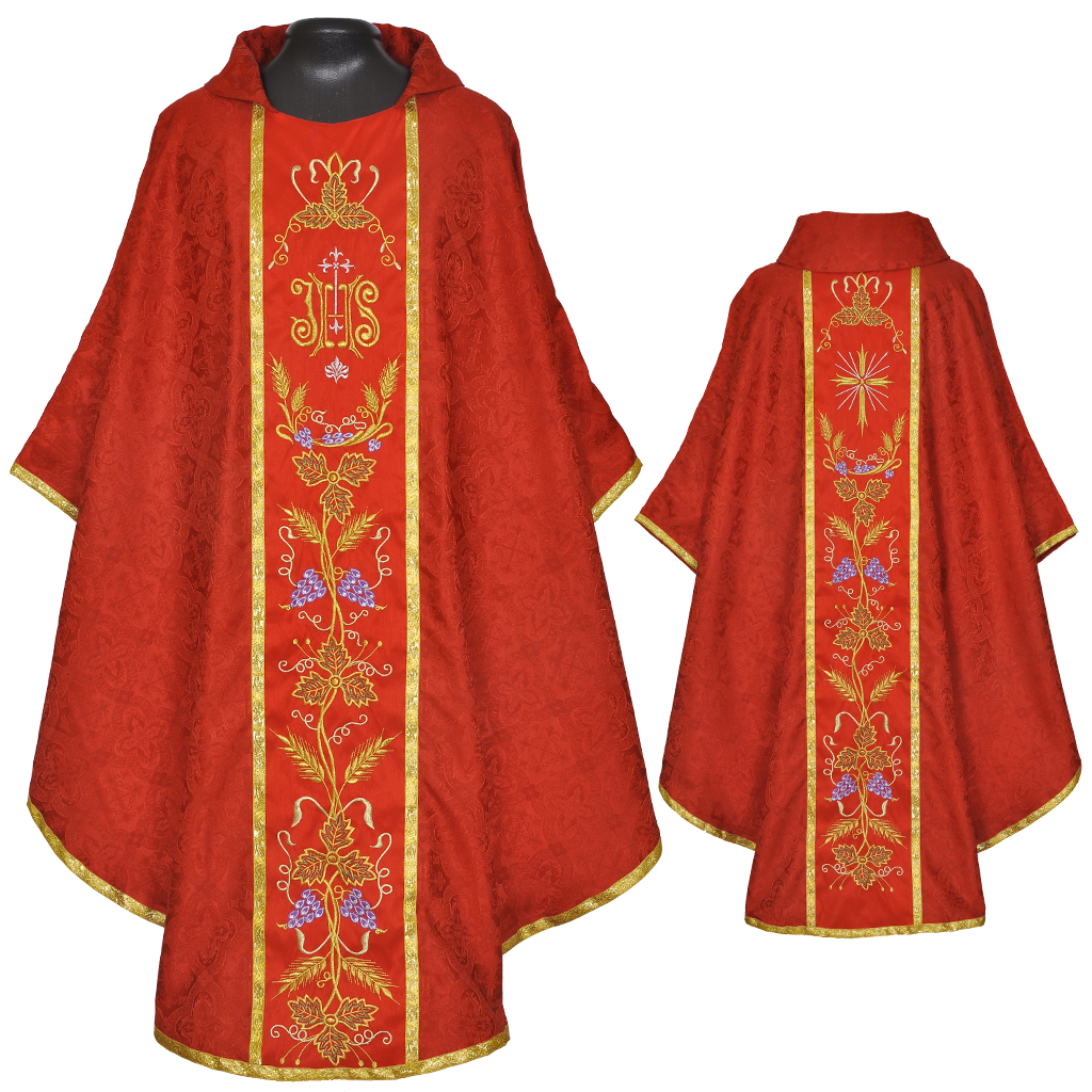 The chasuble is made with Cross Designed Church Damask/Brocade fabric and the Orphreys are made in silk fabric. The embroidery in the Orphrey panels are in Floral Designs with IHS, Cross, Grapes, Grape vine, Wheat and Cross designs. All embroidery work is done in metallic gold, silver, purple and green yarns.