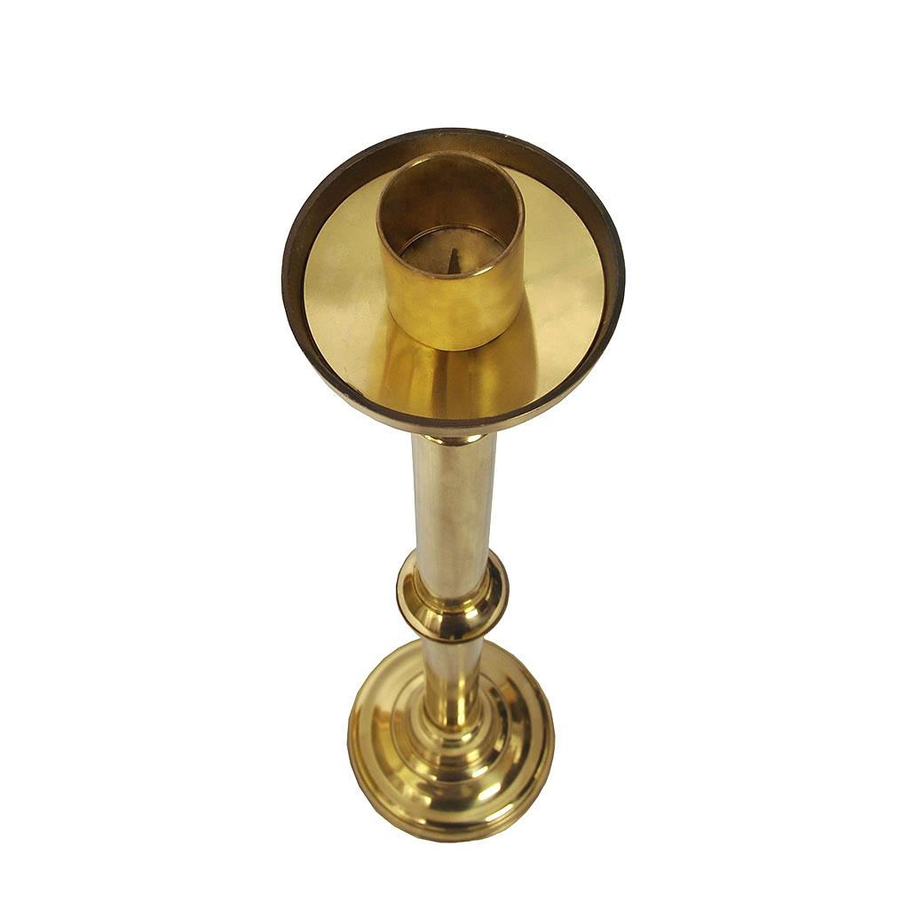 These Candle stands are handmade with base metal Brass and are Industrial Gold Plated. The Candle Sticks stand 26 inches (66 cm) tall with a base diameter of 5.5 inches (14 cm) wide .