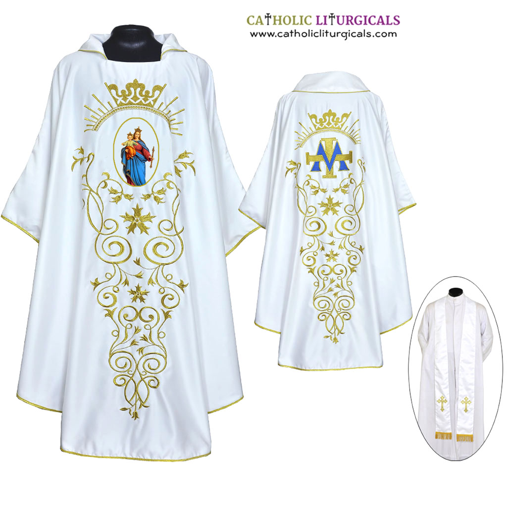 The vestment is made of heavy Polyster Fabric with Ave Maria embroidered directly on the chasuble.