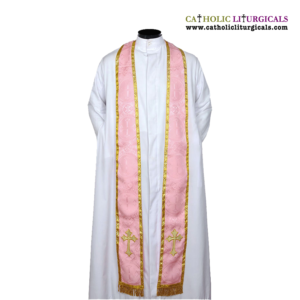 The benediction cope vestment is accompanied by a matching stole, and measures 48 inches, featuring a cross at the ends and a cross on the back of the neck. Fringes at the ends add a touch of elegance.