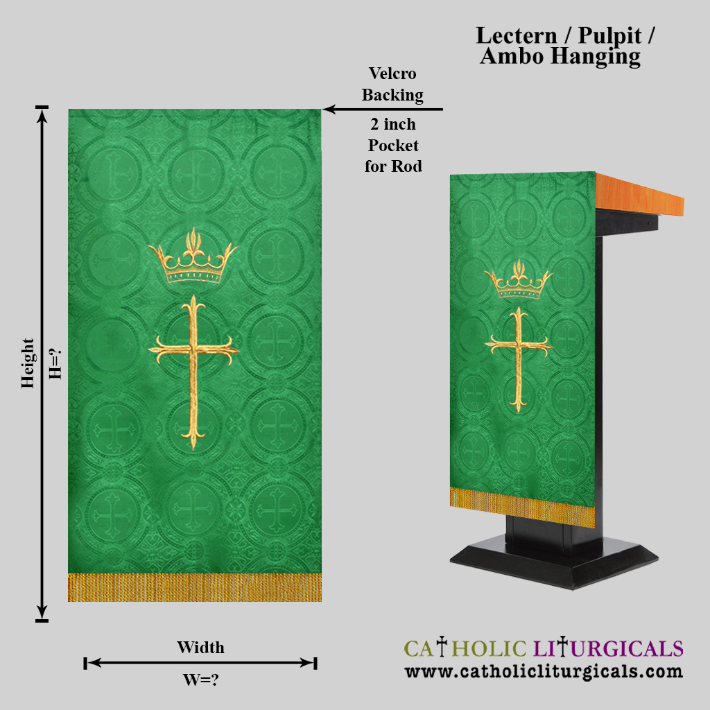 This Hanging - is made of Cross, Crown & Thorn Design Damask Fabric. The hanging is lined with satin fabric and interlined with felt fabric for stiffness. The hanging comes with a 2 inch pocket for rod on the top. The normal height of the hanging ranges between 32 - 48 inches. The maximum width of the hanging is 24 inches.