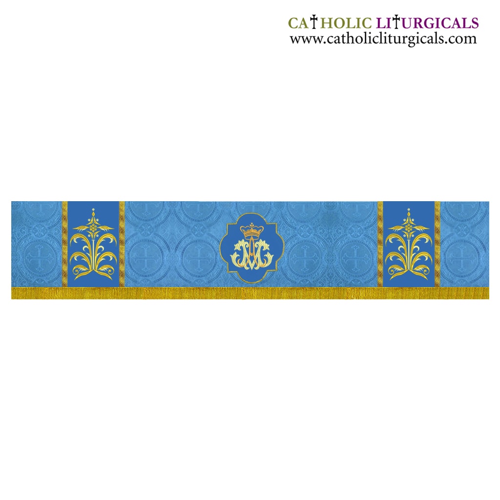 The Altar Parament - is made of Damask Cross Design Fabric and Ave Maria Embroidery. The frontal comes with a 3 inch extra satin fabric on the top to pin it to the Altar Frontal. The height of the Parament is 14 inches including the 2 inch fringes at the bottom. The number of Scallops at the bottom depend on the length of the parament. If the parament is 6ft, it will have 5 scallops and so on.
