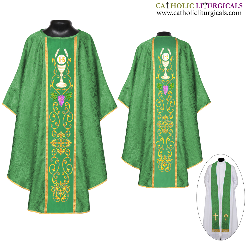 The vestment is made of Church Damask Fabric with Cross Designs. The Orphrey is Embroidered with Chalice Designs. The Vestment comes with a matching Stole, Maniple, Burse & Chalice Veil with matching cross embroidery at the bottom and a small golden cross at the mid point of the Stole and Maniple. The ends of the Stole and Maniple are finished with fine rayon fringes.