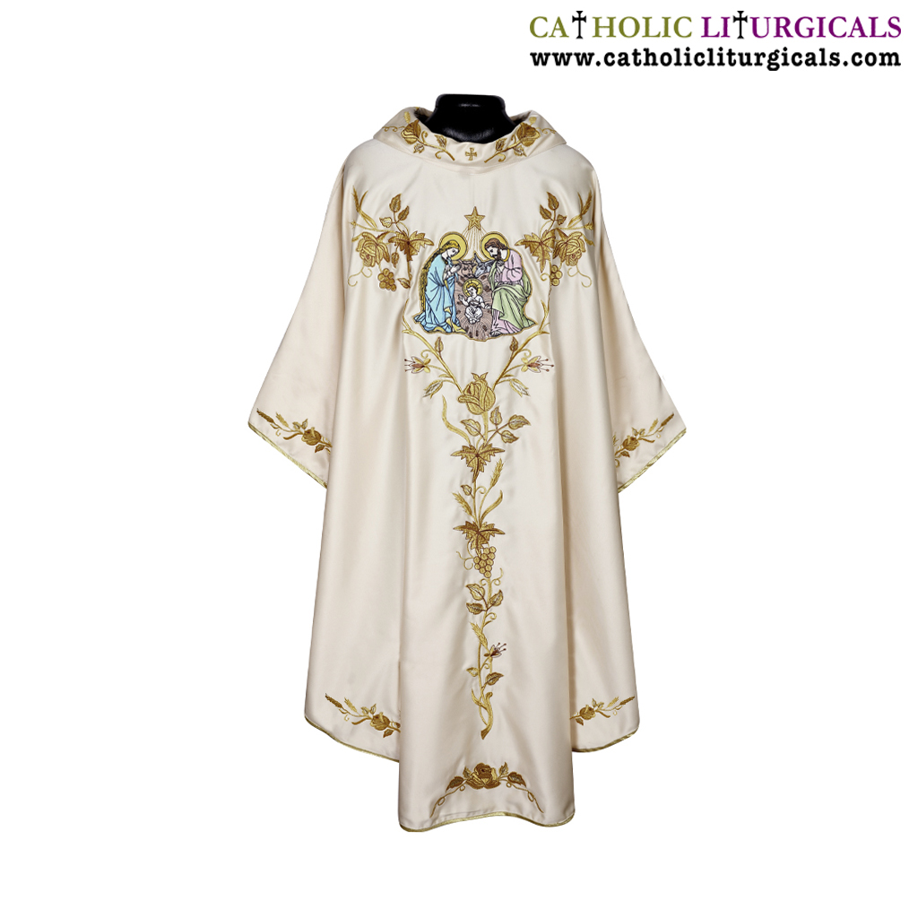 The vestment is made of Polyester Fabric with Floral embroidered directly on the chasuble. The nativity design is not ordinary print or painting, but 100% thread work with 27 different shades of yarn. The back side of the chasuble has a Ave Maria embroidered below it and beautiful Floral design with Roses.