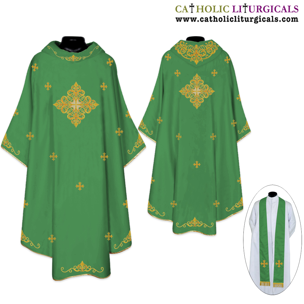 Green Gothic Chasuble & Stole Set - Cross embroidery.