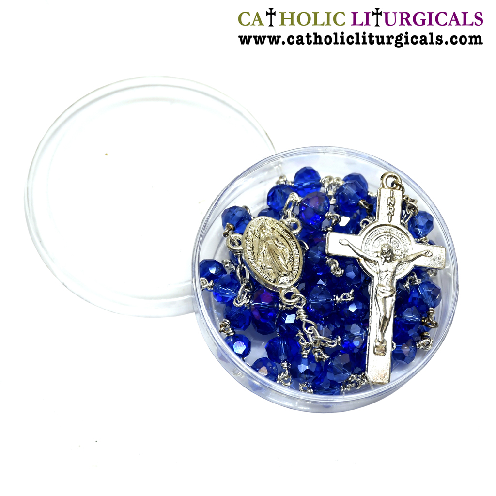The Rosaries are made of Glass Crystal Beads and are linked with brass metal links. The Crucifix & the Pendants are also made of Metal.