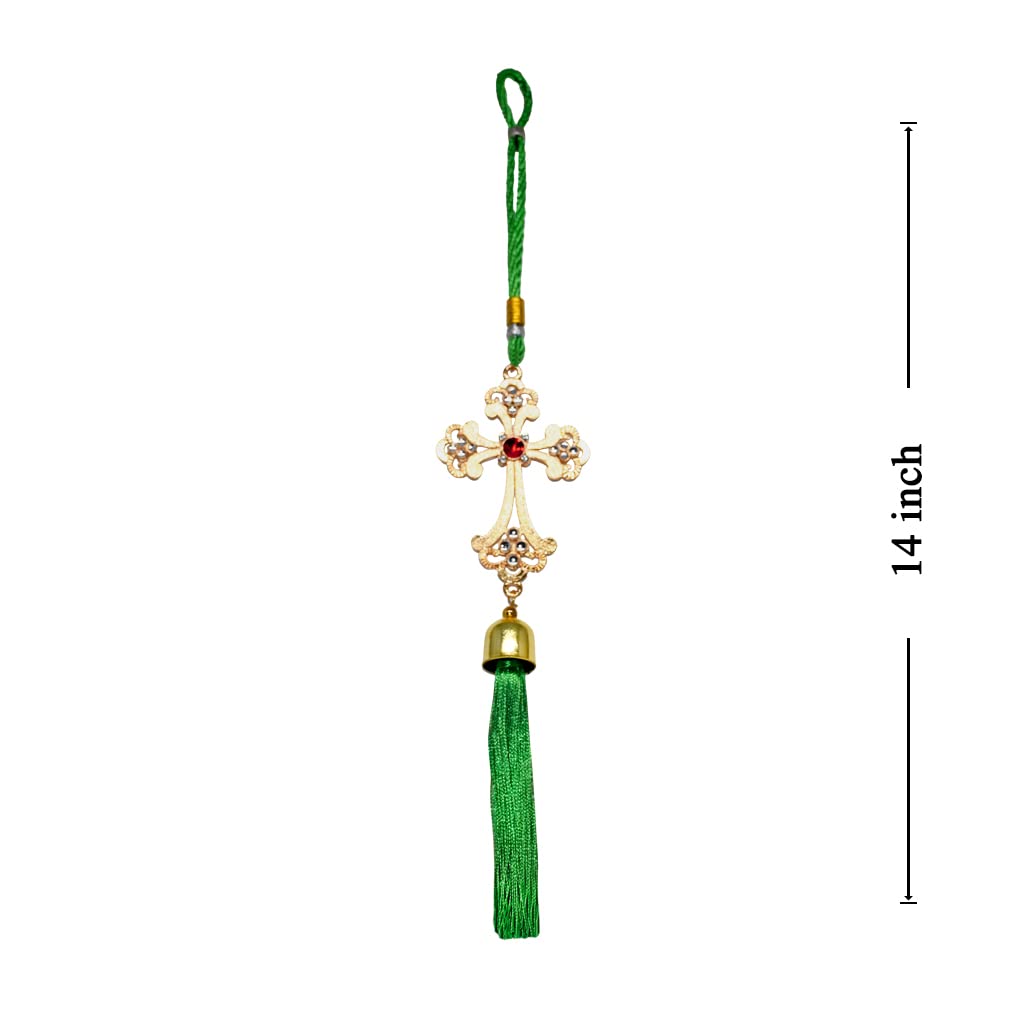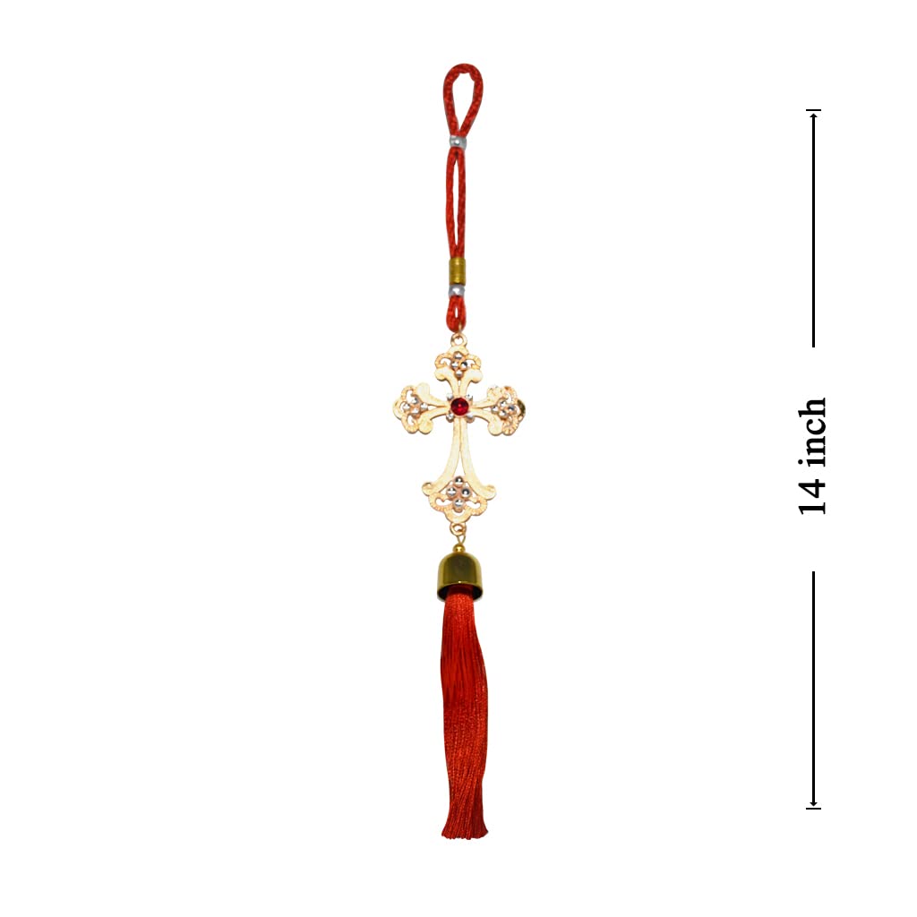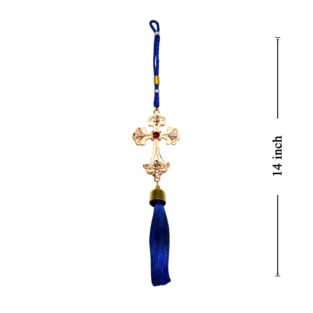 Christian Hanging Cross for Car & Home Decor Universal Fit(For all types of car), dual side visibility, clear vision - no blockage. Cross Comes Metal Alloy - Gold Plated; Dark Blue colour threads for tassel & Dori