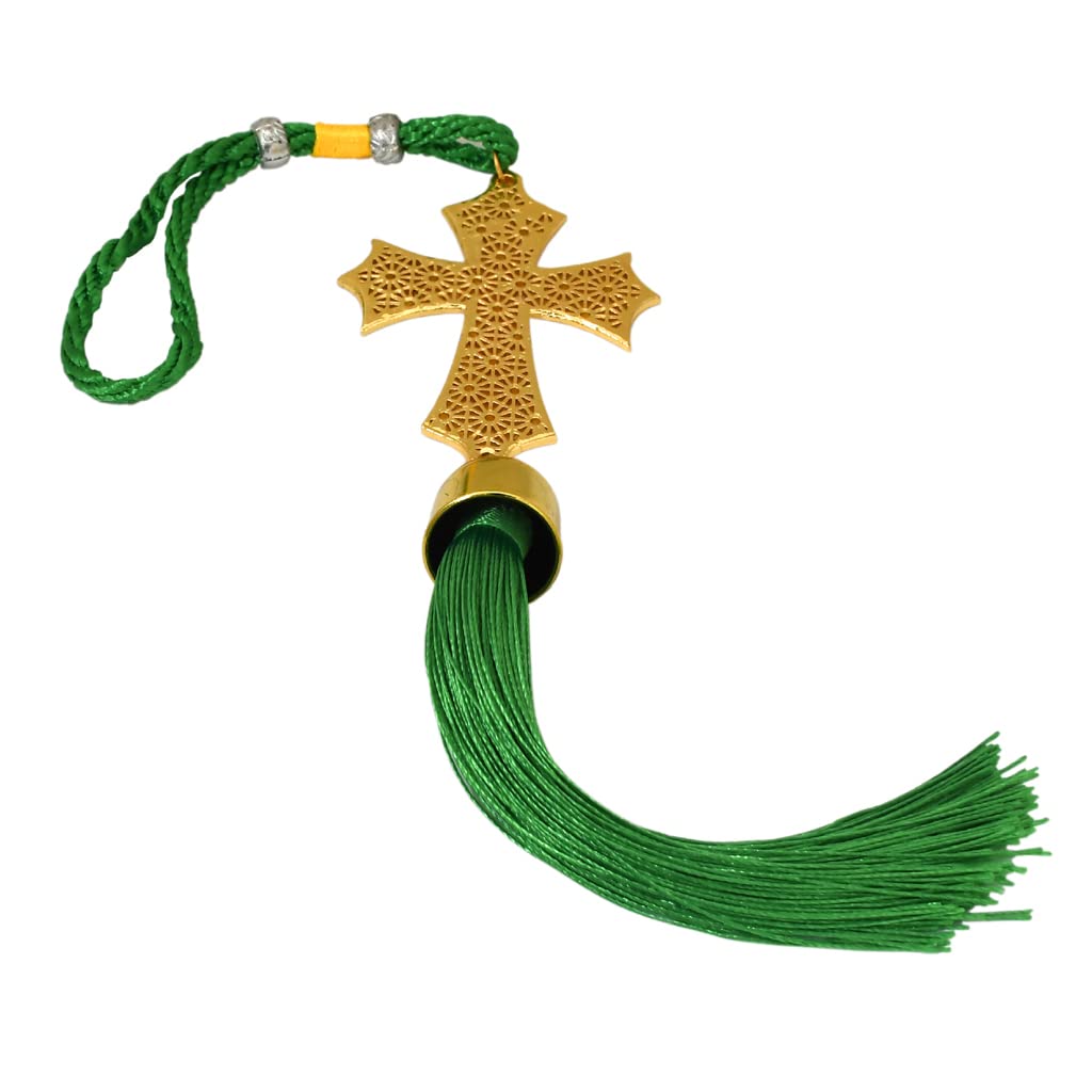 Christian Hanging Cross for Car & Home Decor Universal Fit(For all types of car), dual side visibility, clear vision - no blockage. Cross Comes Metal Alloy - Gold Plated; Dark Blue colour threads for tassel & Dori