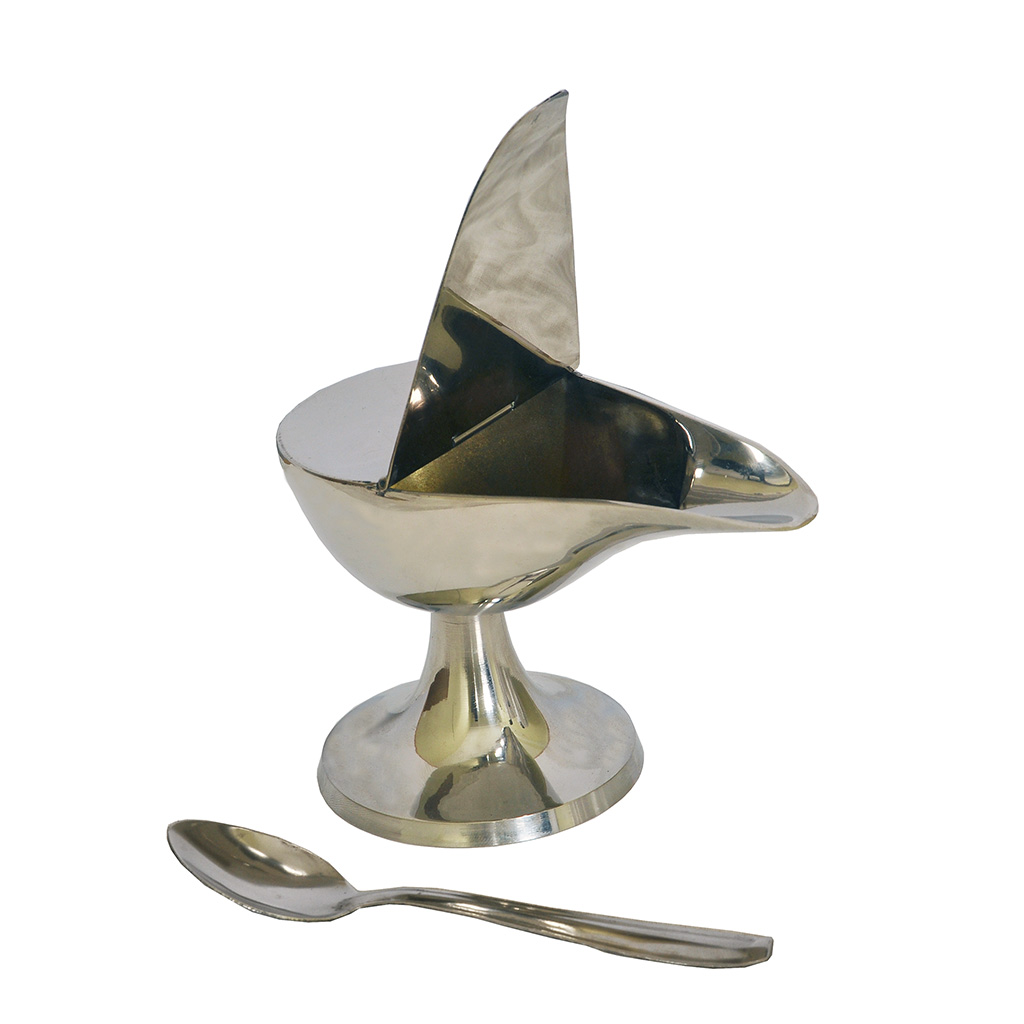 This is a handmade incense boat made of brass and is chrome plated for silver finish. The inside of the boat is kept rough so that the incesne does not slip during use. The Boat comes along with a spoon.