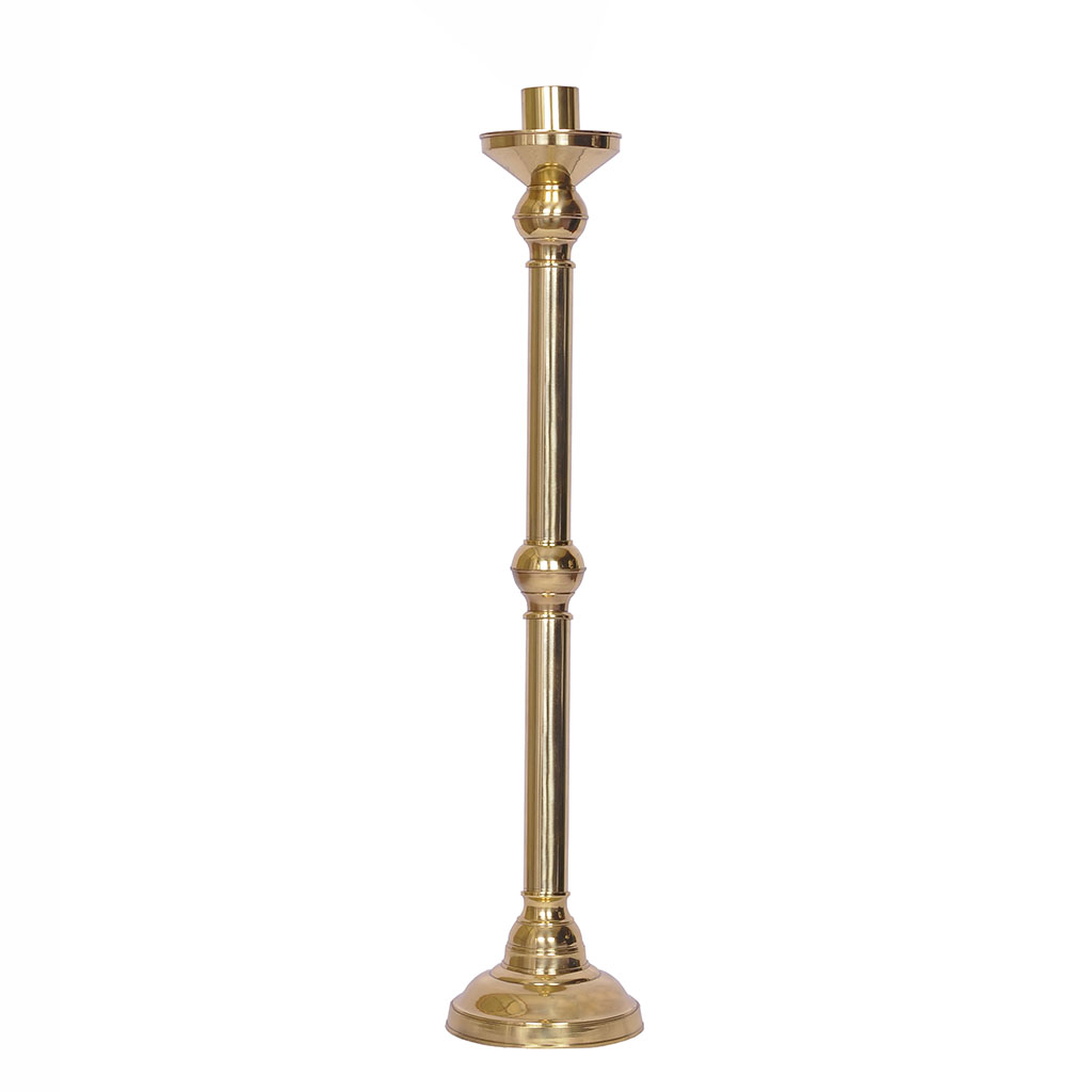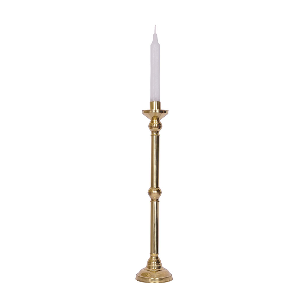 These Candle stands are handmade with base metal Brass and are Industrial Gold Plated. The Candle Sticks stand 26 inches (66 cm) tall with a base diameter of 5.5 inches (14 cm) wide .