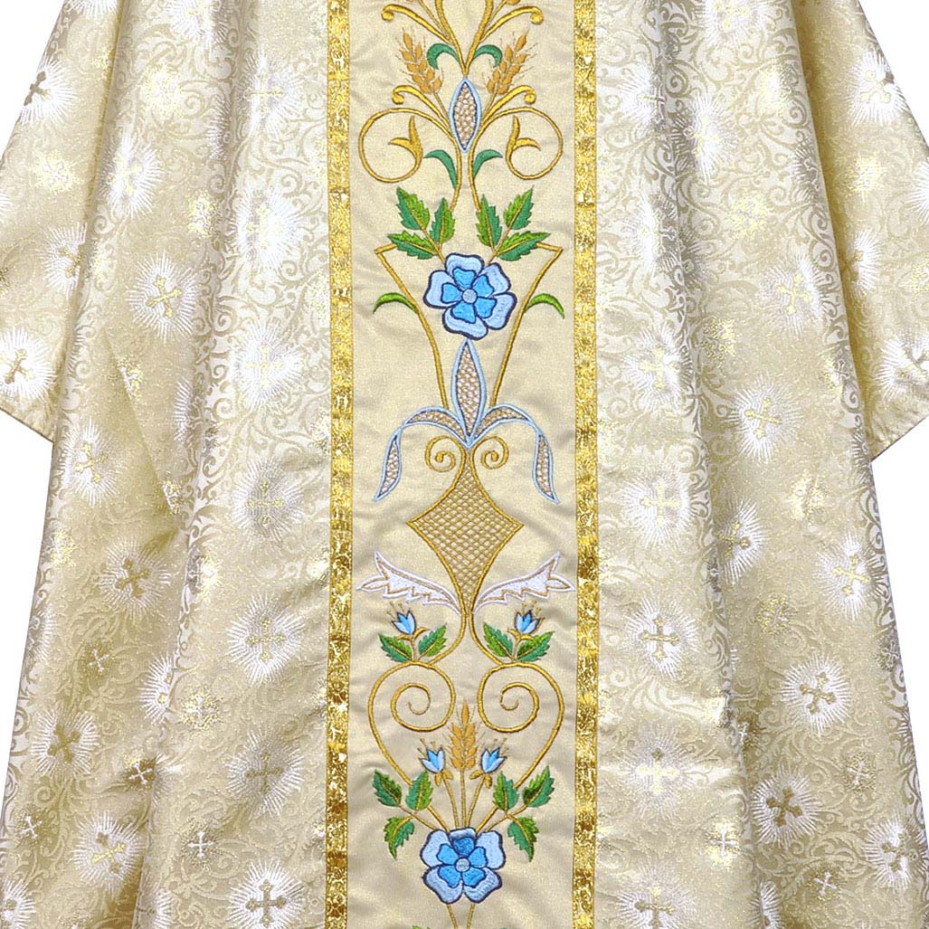 The vestment is made of Light Weight Polyester fabric. The orphreys are made of plain SILK fabric and are richly embroidered with multi coloured floral designs.