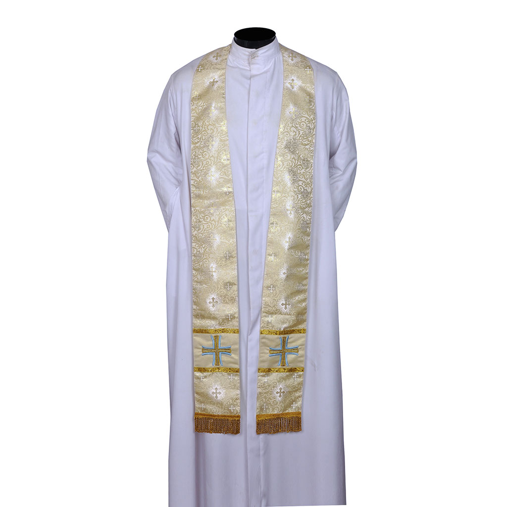 The vestment is accompanied by a matching stole, a vital accessory in spiritual rituals. The stole measures 48 inches, featuring a cross at the bottom and a delicate golden cross on the back of the neck. Fringes at the ends add a touch of elegance.