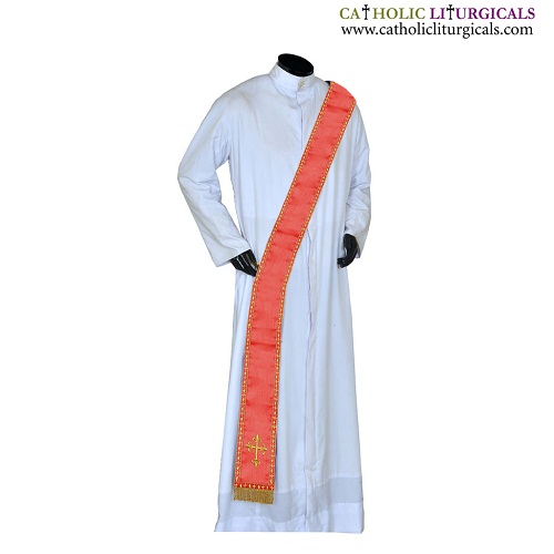 This Deacon Stole is made of Silk Fabric and is fully hand embroidered with cross design in metallic gold yarn. The stole measures 54 inches long from shoulder to the hem and has a stay midway. The top of the stole is 2.5 inches and the bottom is 5 inches wide.
