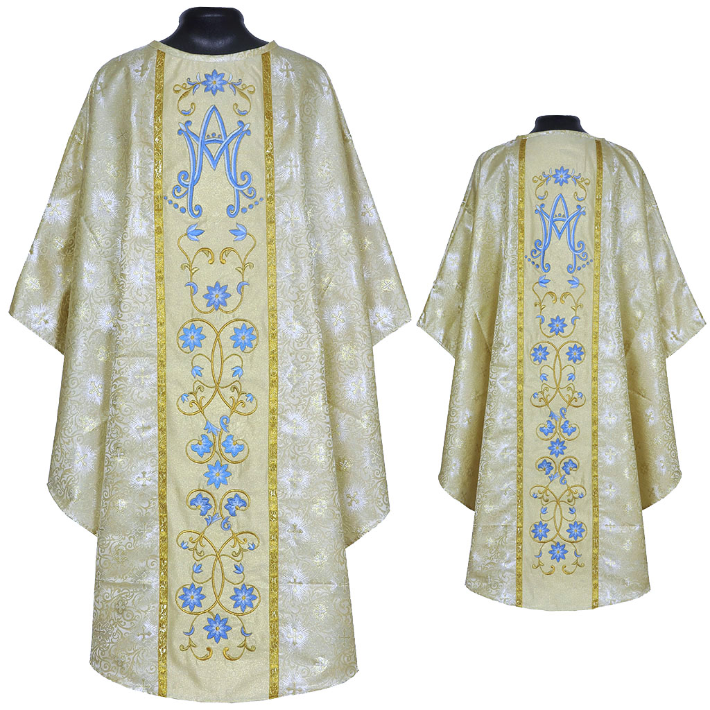 The vestment is made of Brocade Fabric with Cross Designs. The Orphrey is made of plain Gold fabric and is richly decorated with Marian design in multi coloured embroidery.