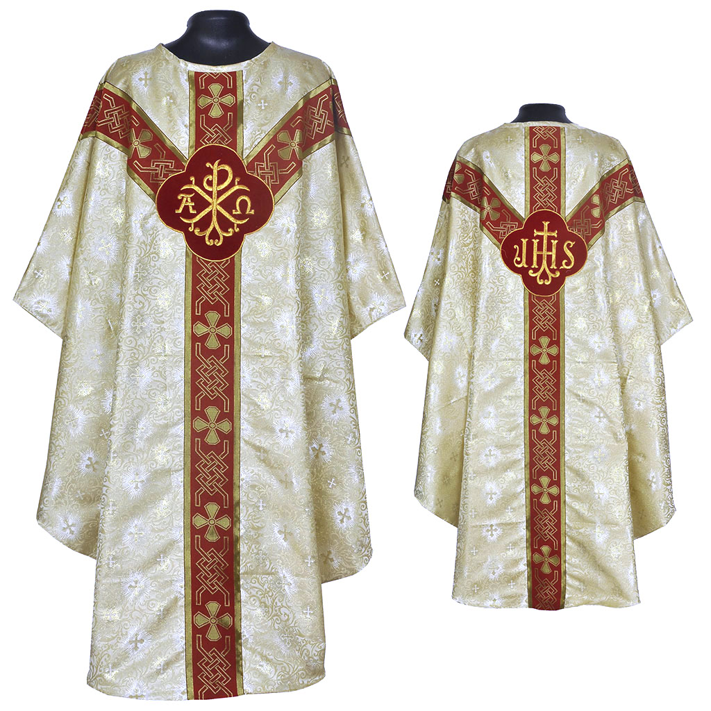 The vestment is made of Metallic Brocade Fabric with Cross Designs. The St. Andrews orphreys (also called - M orphreys) are made of high quality polyester braids and are embroidered with Chi-Rho motif on the front & IHS on the back.