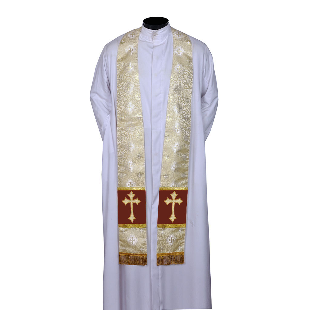 The vestment is accompanied by a matching stole, a vital accessory in spiritual rituals. The stole measures 48 inches, featuring a cross at the bottom and a delicate golden cross on the back of the neck. Fringes at the ends add a touch of elegance.