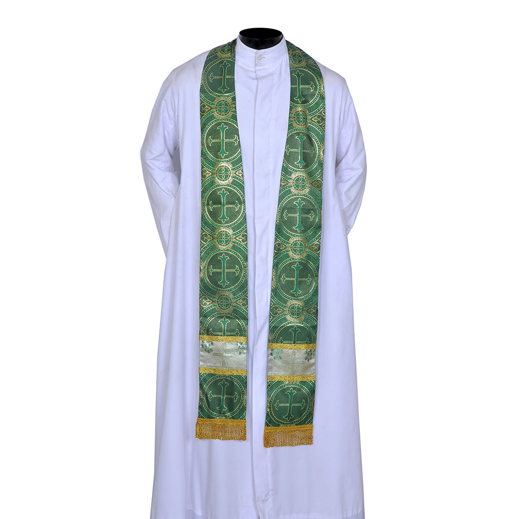 The vestment is accompanied by a matching stole, a vital accessory in spiritual rituals. The stole measures 48 inches, featuring a cross at the bottom and a delicate golden cross on the back of the neck. Fringes at the ends add a touch of elegance.