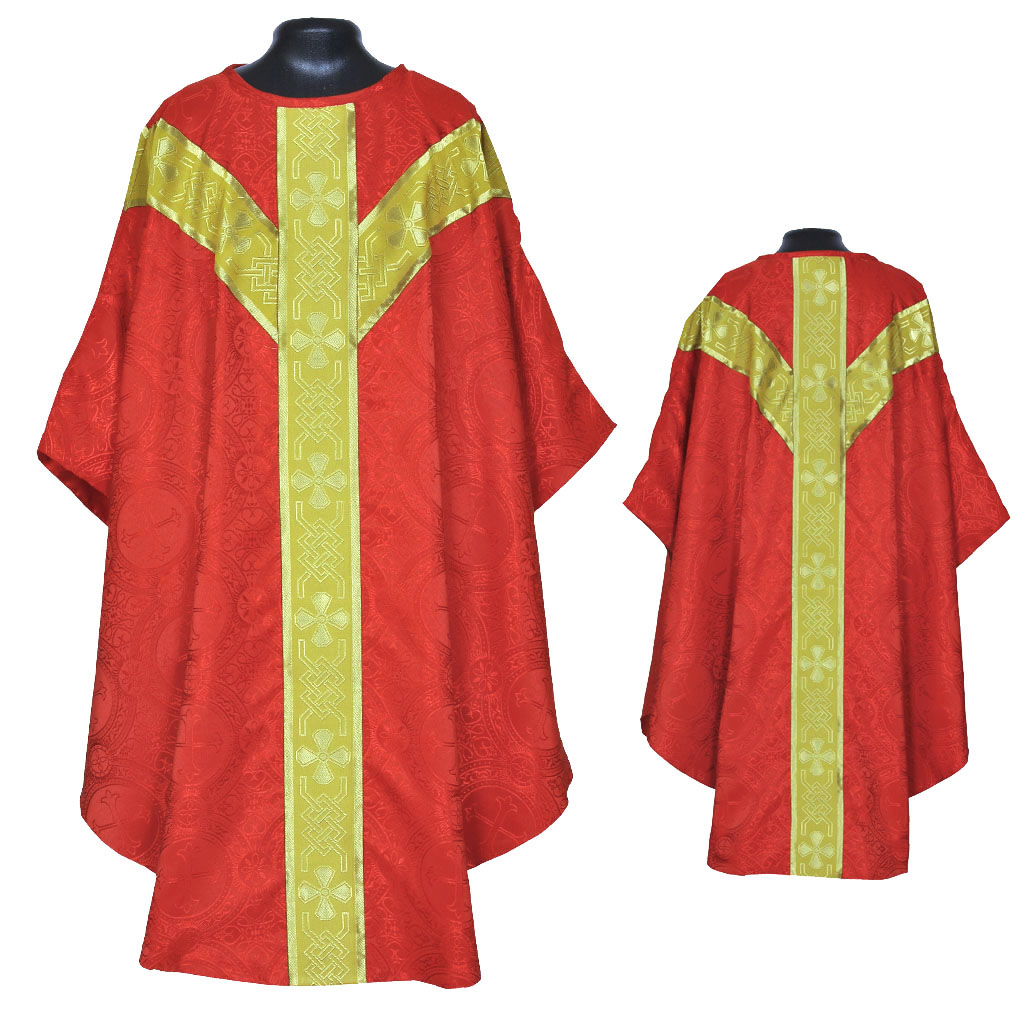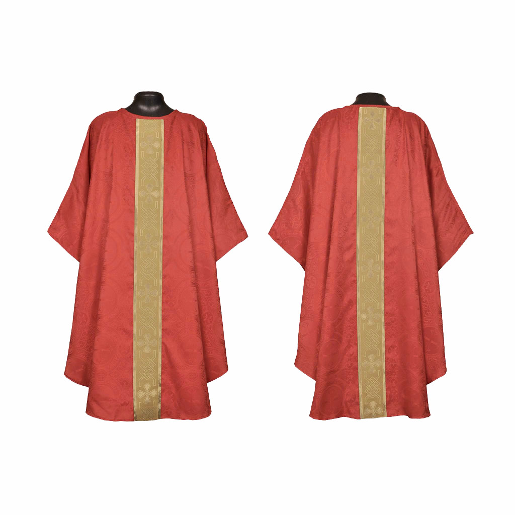 This Dalmatic set is made of church damask fabric with cross designs and the orphreys are made of 4 inch polyster narrow fabric. The dalmatic comes with a matching deacon stole.