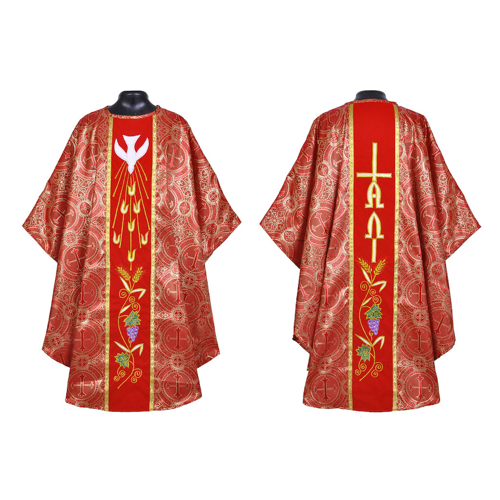 The vestment is made of Brocade Fabric with Cross Designs. The orphreys are made of high quality velour fabric and are beautifully embroidered with Metallic Gold yarn.