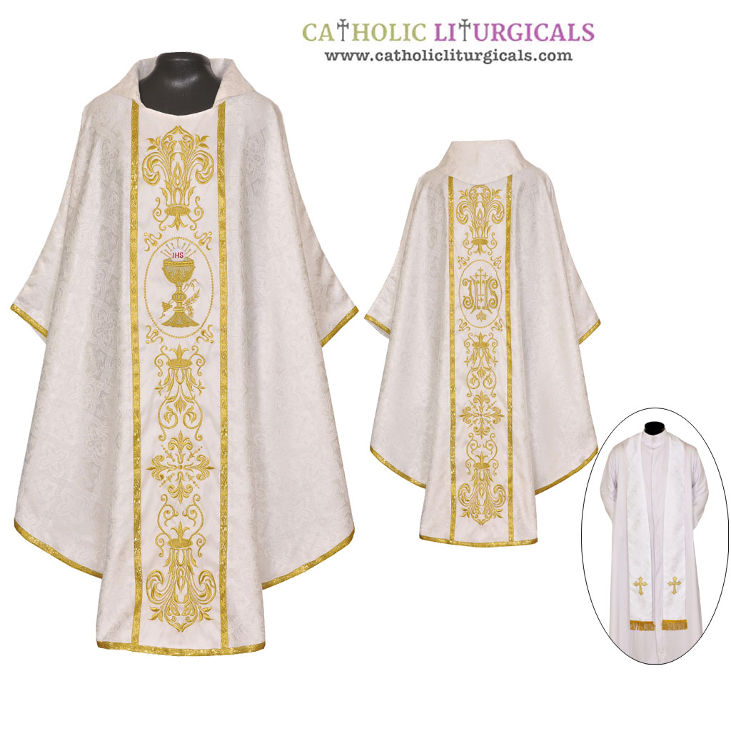 White : Gothic Chasuble & Stole Set - Chalice With IHS