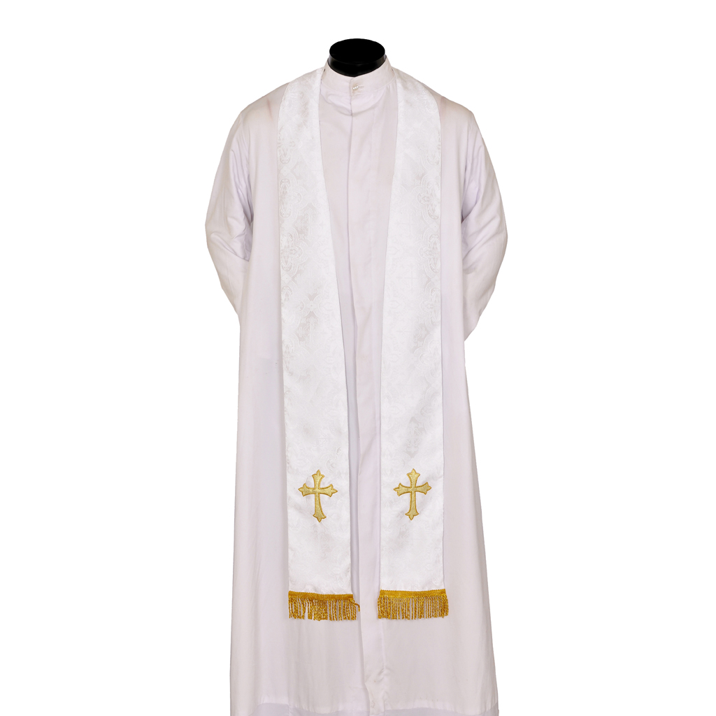 The vestment is accompanied by a matching stole, a vital accessory in spiritual rituals. The stole measures 48 inches, featuring a cross at the bottom and a delicate golden cross on the back of the neck. Fringes at the ends add a touch of elegance.
