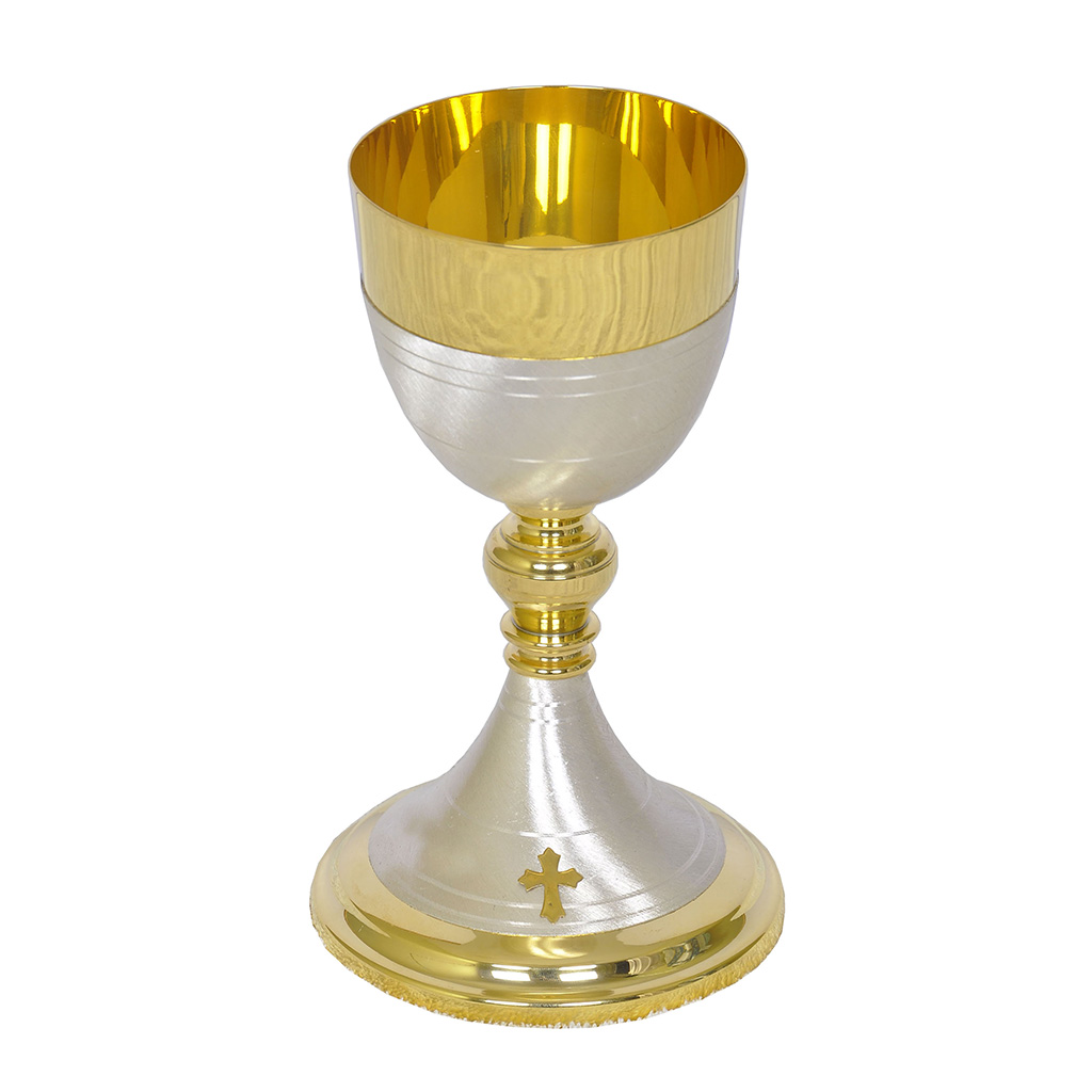 This Chalice is made of Brass Sheet metal and is 24 carat Gold plated. The Chalice comes with an extra layer which is Sterling Silver Plated. The Chalice stands 8.5 inch (21 cm) tall and has a fluid capacity of 10.1 US fluid ounce/ 300 ml. The base of the chalice is not left hollow and is covered with a base plate.