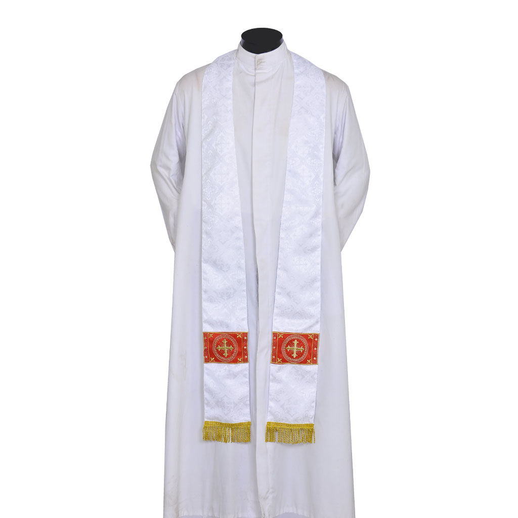 This set consists of a Cope and Stole. The material of the garments is made of Church Brocade fabric with Cross designs and the Orphreys are fully embroidered with cross designs. The cope comes with a Matching Stole.