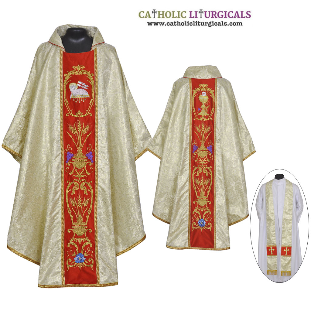 The vestment is made of Brocade Fabric with Cross Designs. The Orphreys are made of velour fabric and are beautifully embroidered with Chalice and Agnus Dei Design.
