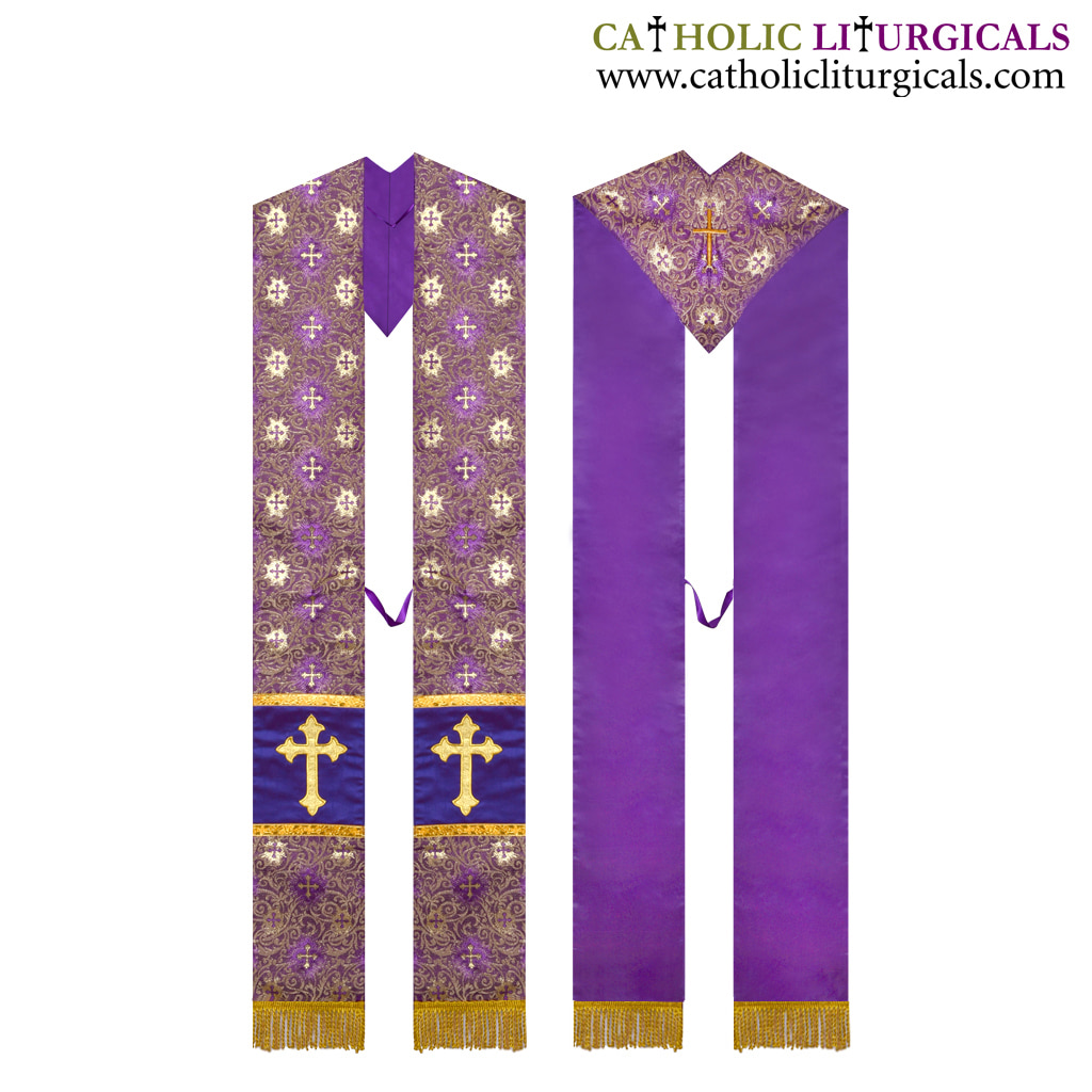 The vestment is accompanied by a matching stole, a vital accessory in spiritual rituals. The stole measures 48 inches, featuring a cross at the bottom and a delicate golden cross on the back of the neck. Fringes at the ends add a touch of elegance.