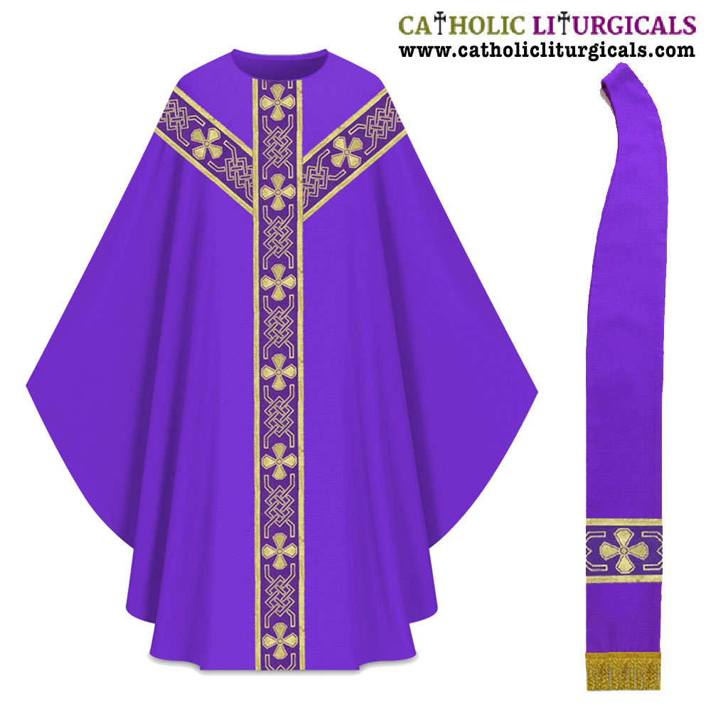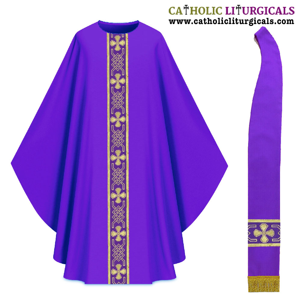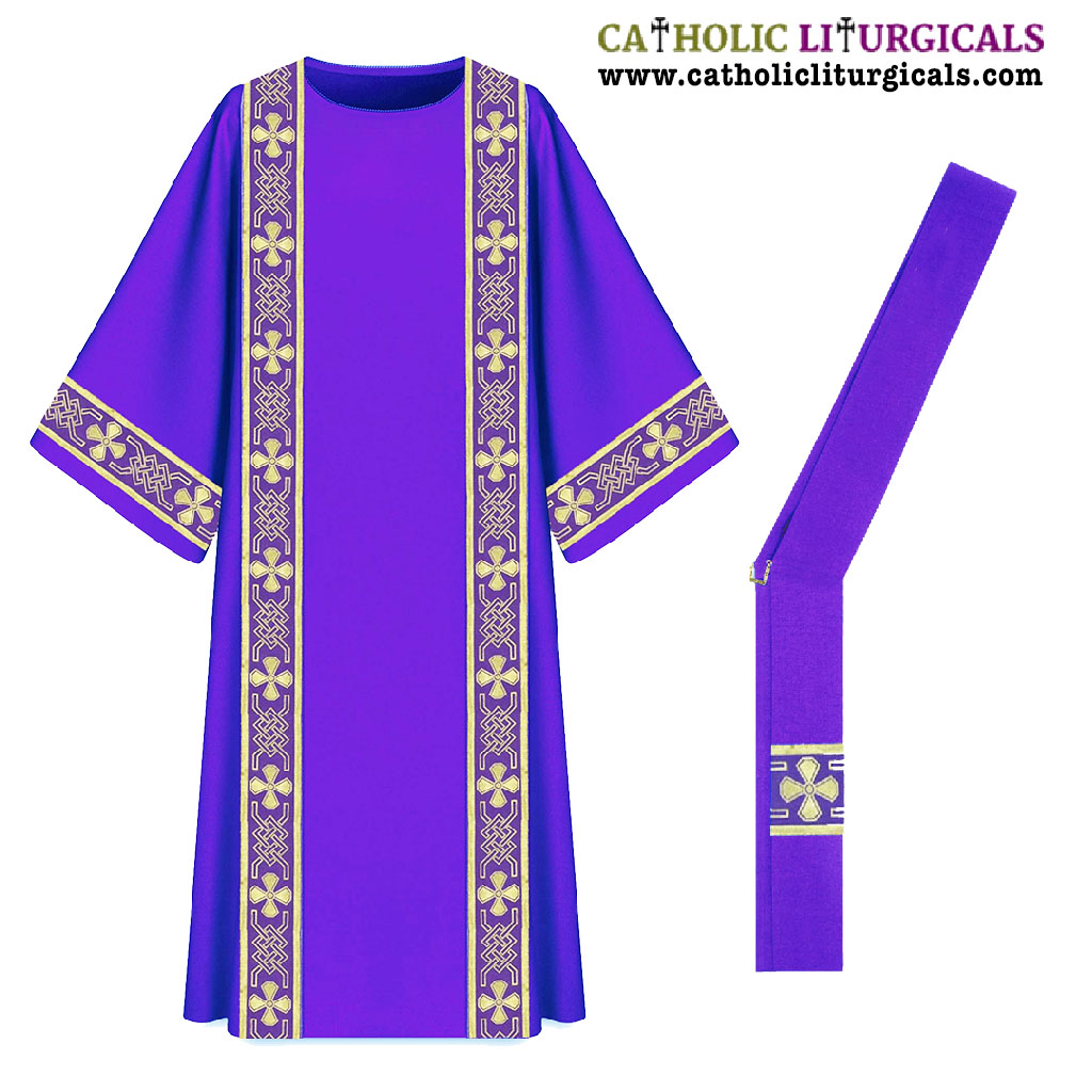 This Dalmatic set is made of polyster fabric and the orphreys are also made of 4 inch polyster woven fabric with cross designs. The dalmatic comes with a matching deacon stole.