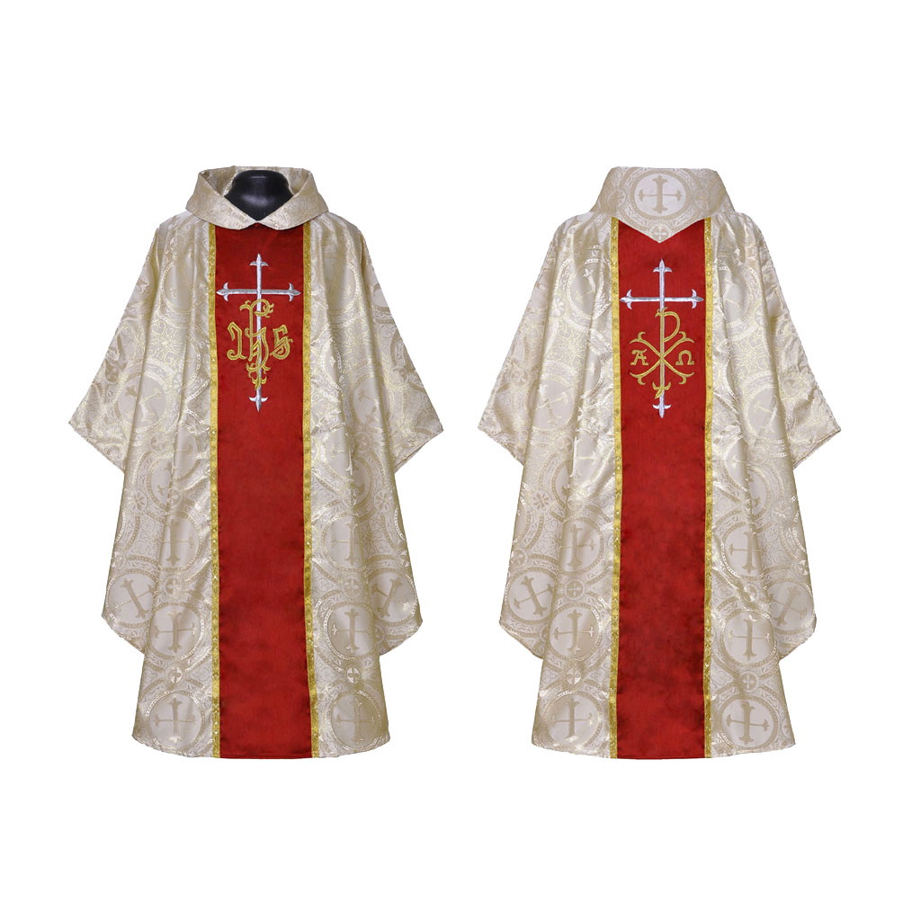 The vestment is made of Brocade Fabric with Cross Designs. The orphreys are made of silk fabric and are embroidered with Metallic Gold & Silver yarns. The vestment comes with V-Collar. The Vestment comes with a matching stole.