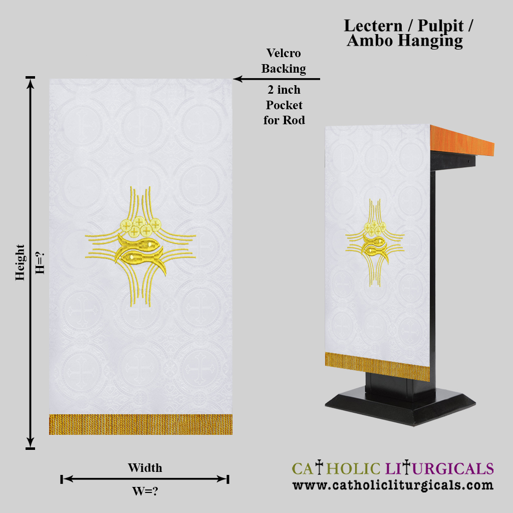 This Hanging - is made of Cross, Crown & Thorn Design Damask Fabric. The hanging is lined with satin fabric and interlined with felt fabric for stiffness. The hanging comes with a 2 inch pocket for rod on the top. The normal height of the hanging ranges between 32 - 48 inches. The maximum width of the hanging is 24 inches.